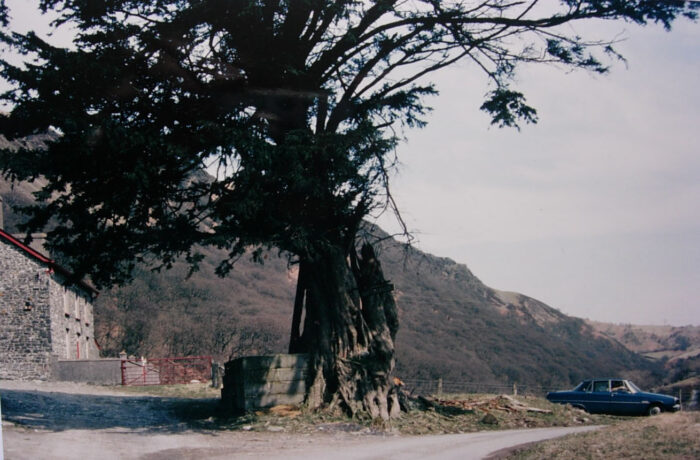 Notes: On the most southerly road to cross the Cambrian Mountains. The yew is at the entrance yard to Aberbranddu Farm. The photograph, supplied by Janet Shelly, was taken about 40 years ago when a large portion of the tree was severely damaged by storms. Janet's grandparents, who lived in a house sheltered by the lost Cilwern Yew, had cousins who lived at Aberbranddu Farm.