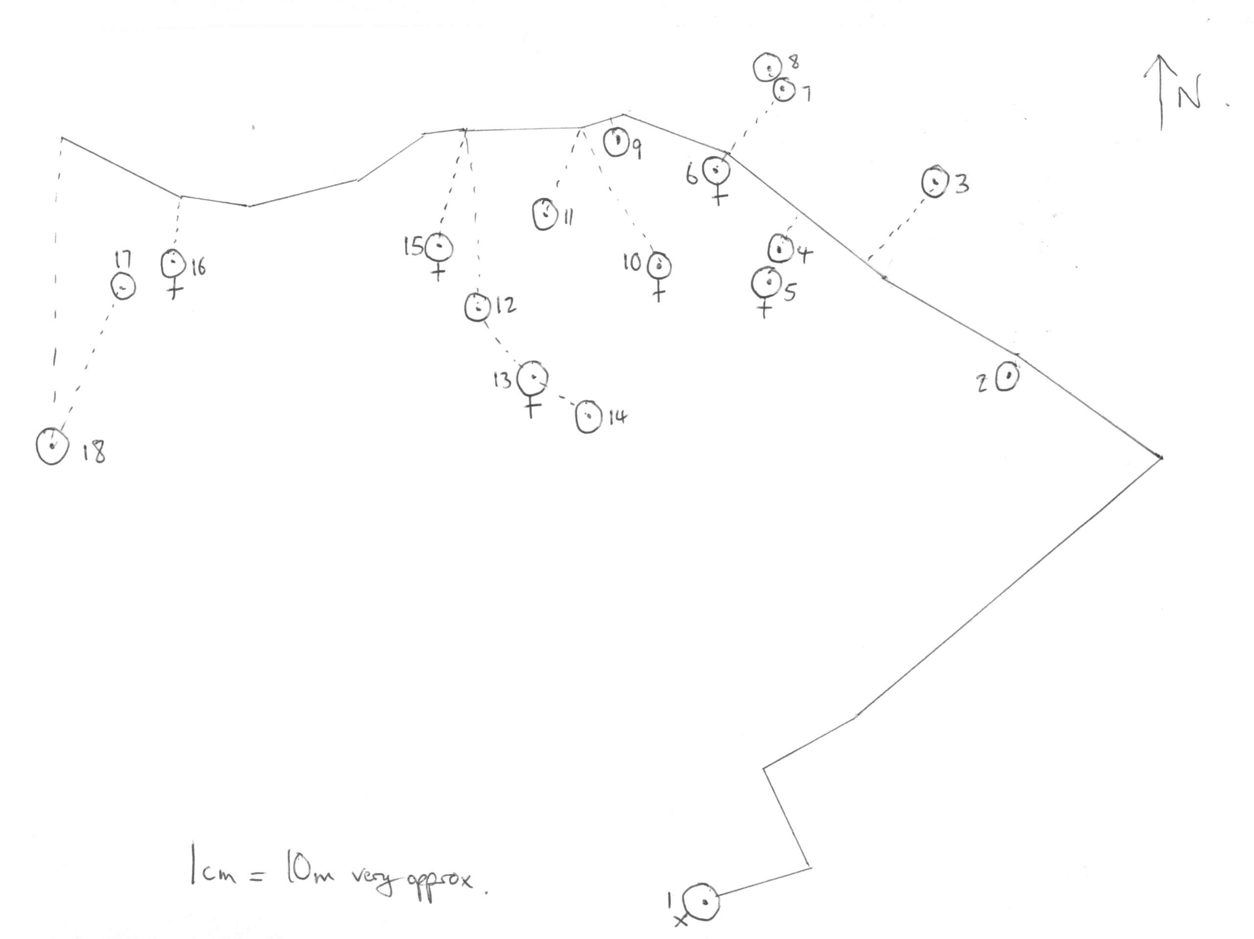 Notes: Inaccessible woodland with dense undergrowth. Permission is needed to visit this private wood and the grid reference and coordinates are only approximate. During this visit 18 yews were recorded of which the largest girthed were 16', 18' and 22' and 11 were in the range 13'/15'. Three of the smaller girthed yews do not appear in the tree information below. Tree 1 had a girth of 10' 11'' (333cm) at the ground, with burrows beneath and several branches from bole at between 4' and 7'. Tree 13 is a female yew with a girth of 12' 11'' (394cm) at 3'. Tree 16 is a female yew with a girth of 10' 7'' at 2' with burrowing beneath the tree. It leans considerably. A low dead branch has split from the tree, but was still well joined at 5' on the bole. It rests on the ground and gives support to the tree (for the moment).