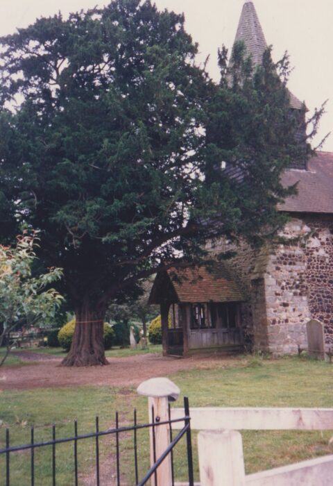 Notes: The site of the church is about half a mile east of the village in an isolated position. The churchyard is small and surrounds the buildings; there are several large trees on its boundaries, and near the porch is a yew-tree. From: 'Parishes: Bisley', A History of the County of Surrey: Volume 3 (1911), pp. 398-99.