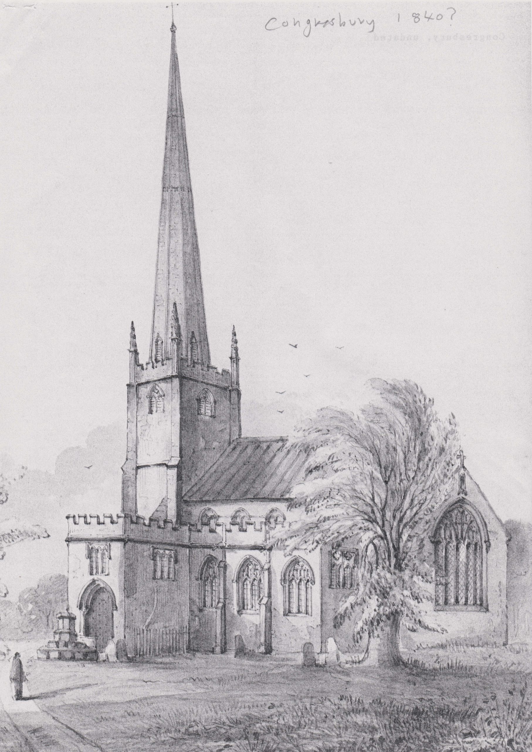 Notes: St Andrew's church was consecrated in 1215. It is considered by some to have been built on the site of St Congar's original wattle church. The drawings dated 1829 and (possibly) 1840 show a tree SE of the church. Are they artistic representations of the Congresbury Yew? In Rutter's 1826 Delineations of the NW Division of Somerset is the following: "The chancel windows are good specimens of the perpendicular era, and are shaded by an unusually fine yew tree."