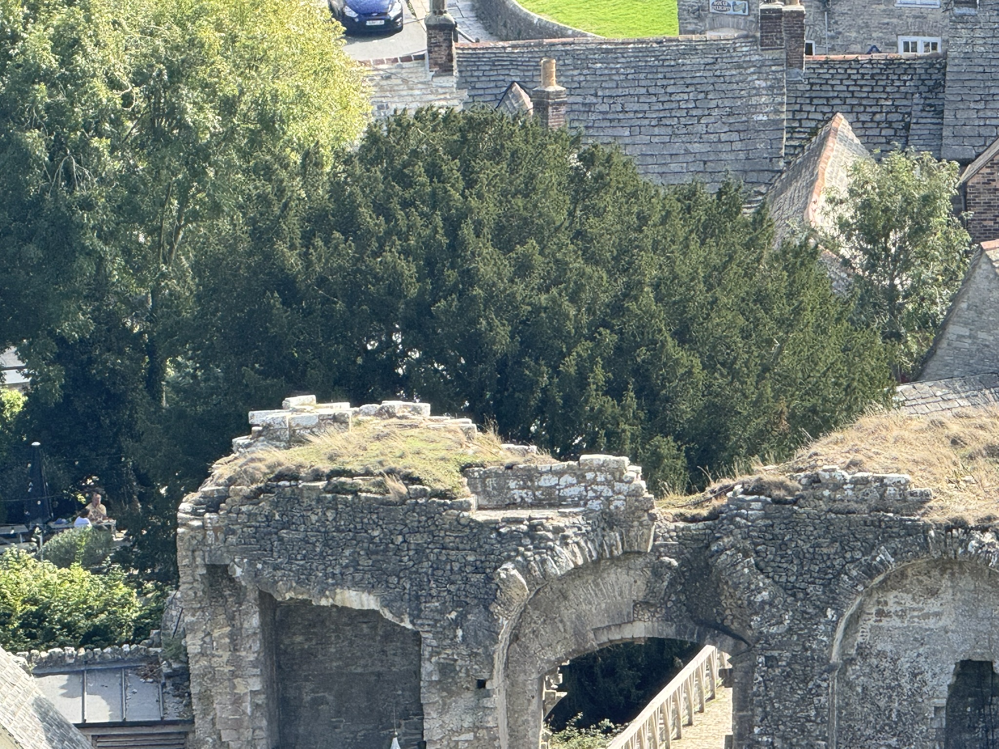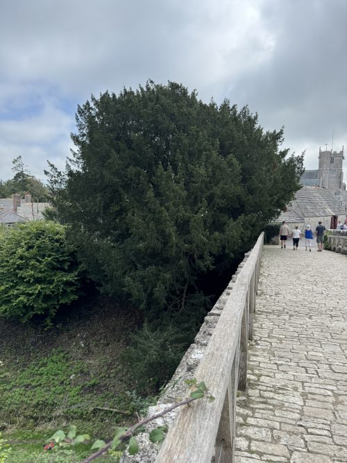 Notes: The yew grows at the bottom of a dry moat. This is crossed on a stone bridge leading to the castle entrance.