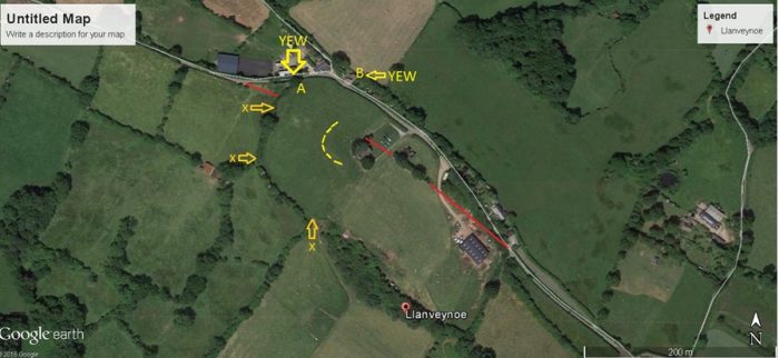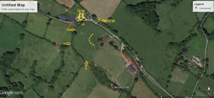 Notes: A remote location beneath the Black Mountains. The curving ditch is shown on the map as a broken yellow line. The current hedge boundary with the two yews in has been marked X. It reflects the curving ditch in the field nearer the church. Also note that the red line probably marks a boundary or road that has been truncated by the church and its present setting. The 1st edition ordnance survey map shows a network of roads leading seemingly to nowhere. This site is puzzling and asks the question whether this was once a major church or monastic site in the so called Dark Ages.