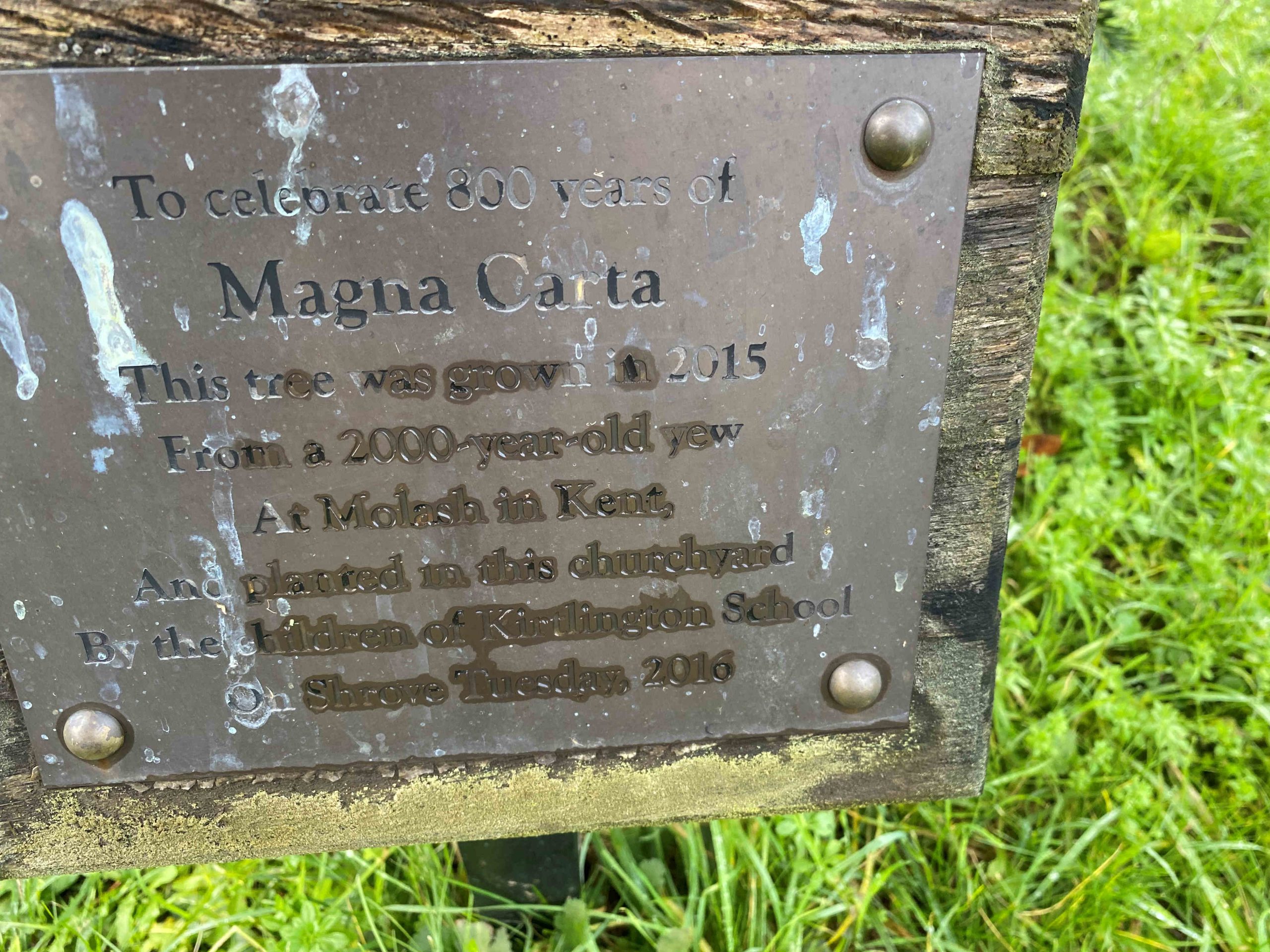 Notes: Though the church dates only from the 13th century the site is thought to be considerably earlier. It is undoubtedly one of Kent's finest multiple tree sites. There are six yews with girths above 5m and records of a seventh, now lost. The young yew shown here grows in Kirtlington churchyard in Oxfordshire. The plaque reads "To celebrate 800 years of Magna Carta this tree was grown in 2015 from a 2000 year old yew at Molash in Kent, and planted in this churchyard by the children of Kirtlington School, Shrove Tuesday 2016." While it is possible that some of the Molash yews might have an age above 1,000 years, there is no evidence currently available to prove that any of its yews were growing 2,000 years ago.