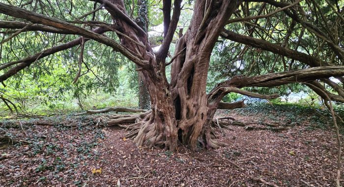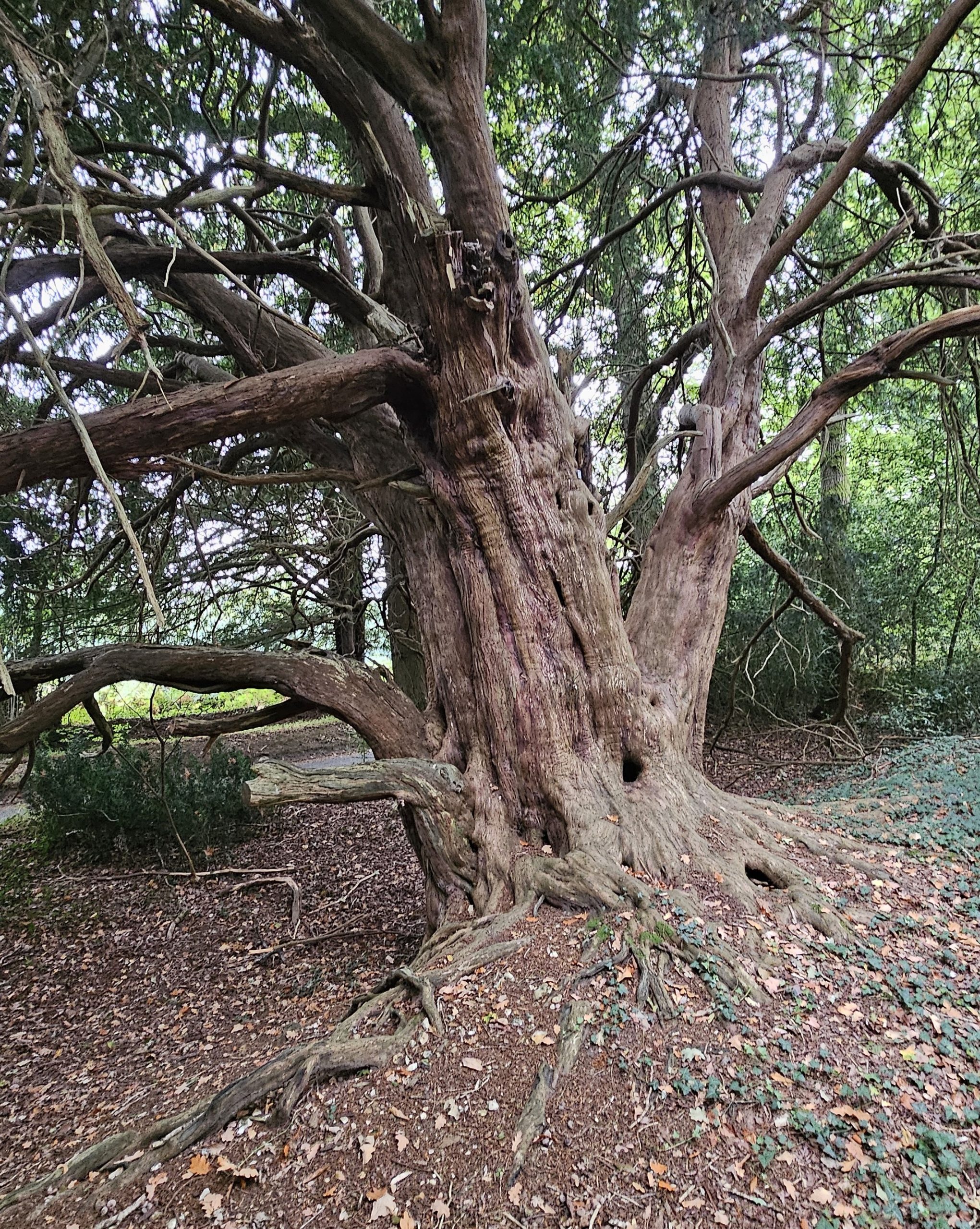 Notes: This is National Trust land with public access. The yew grows on a raised bank just of the minor road (Back Lane) As well as this old yew, there are many younger yews growing on raised banks either side of the lane as one approaches the car park.