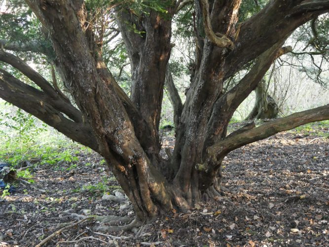 Notes: A line of yews grow along a public footpath near the junction of Holmwood Avenue and Mitchley Hill. It is likely that one of these trees features in a D.H.Lawrence poem 'Yew tree on the Downs', a location that is also mentioned in his novel 'The Trespasser'.