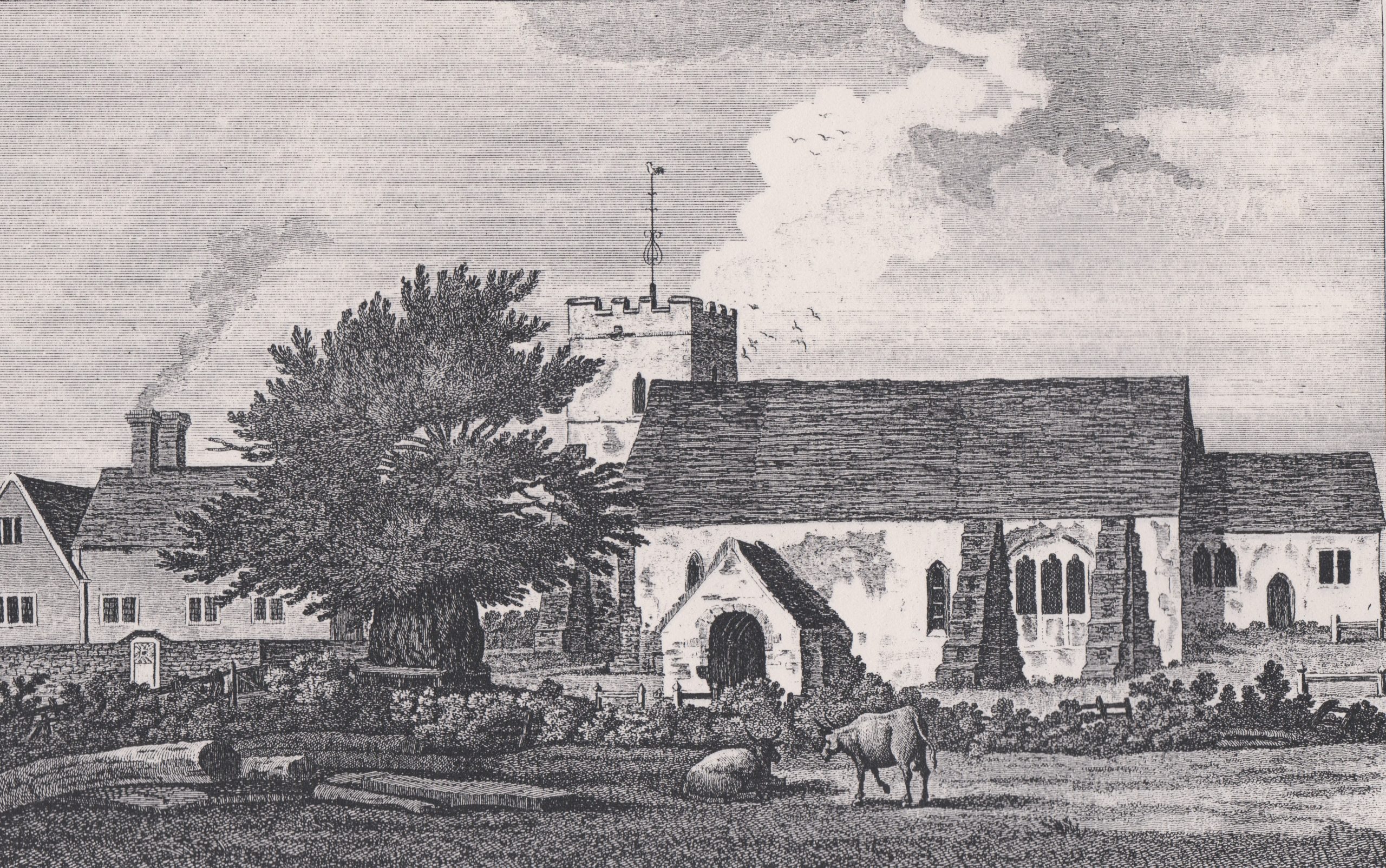 Notes: A church was founded here in 1049. The yew, in spite of being reduced to a stump, was chosen to be one of the 50 Great British Trees to celebrate the Queen's jubilee year. The postcard called it 'the largest yew tree in the world'. Wood from the yew was used to make the fine altar and a branch cross section is displayed in the church porch.