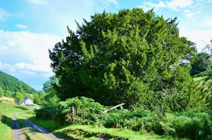 Notes: The yew is found 285 metres west of Stowe church in a small area called Birds Holding. It grows on the south side of a stream and next to the footpath that ascends to Lords Wood.