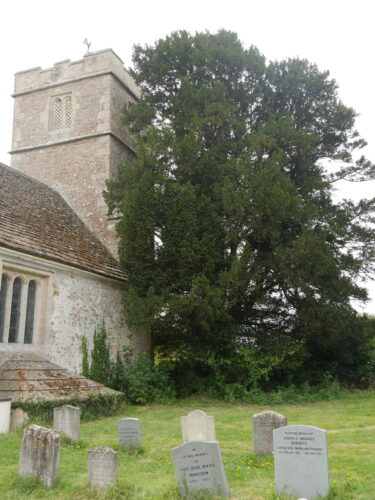 Notes: The yew grows 2 metres from the church and 50cm from the wall of an adjacent garden. The church website states that the 'old yew tree beside the tower was quite possibly planted in obedience to a statute of Edward 1 (1272-1307) ordering the planting of yews in churchyards, so that his archers might have a supply of this wood for their bows'.