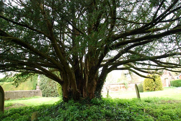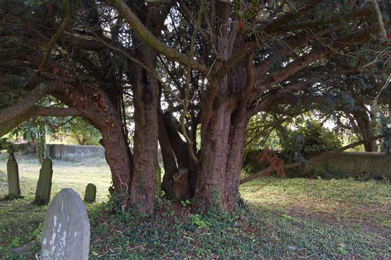 Notes:The most interesting of 4 yews in this churchyard grows NW of the church. The female yew comprises four trunks in a circle, of which two split into further branches at about 2’ from the ground. All appear to share the same root system. Measurement was difficult but one trunk which splits into three measured 7’ 10” (239cm) at 1’. The second, split into two branches, measured 6’ 8” (203cm) at the root crown, while the remaining two trunks measured 4’ 4” (132cm) and 6’ 4” (193cm) respectively. Measuring the girth around all the growth returned a figure of 18’ 2” (554cm) close to the ground. If this is re-growth from a felled yew then reducing this figure by 10% would return an original girth of around 16’ (488cm).