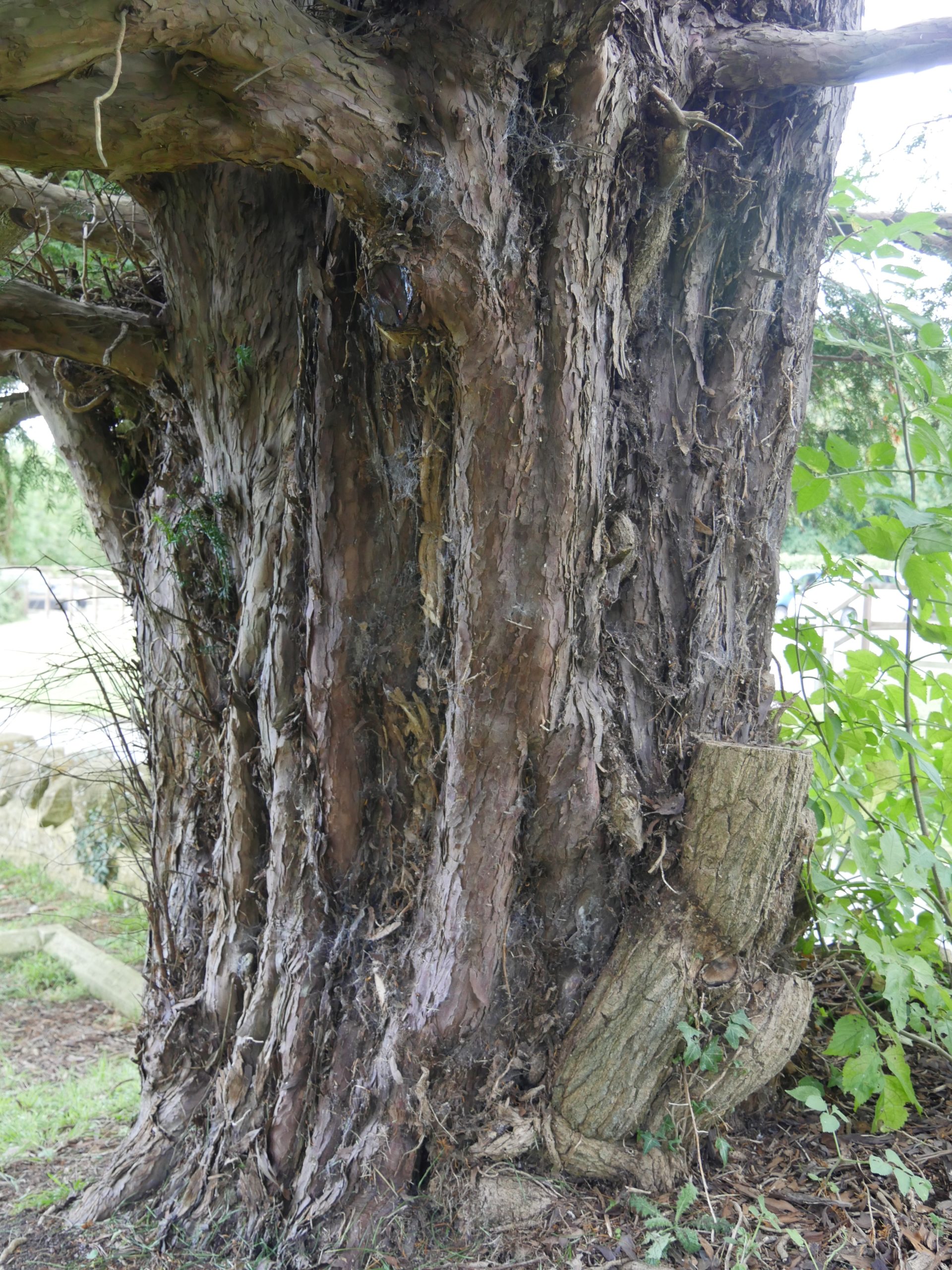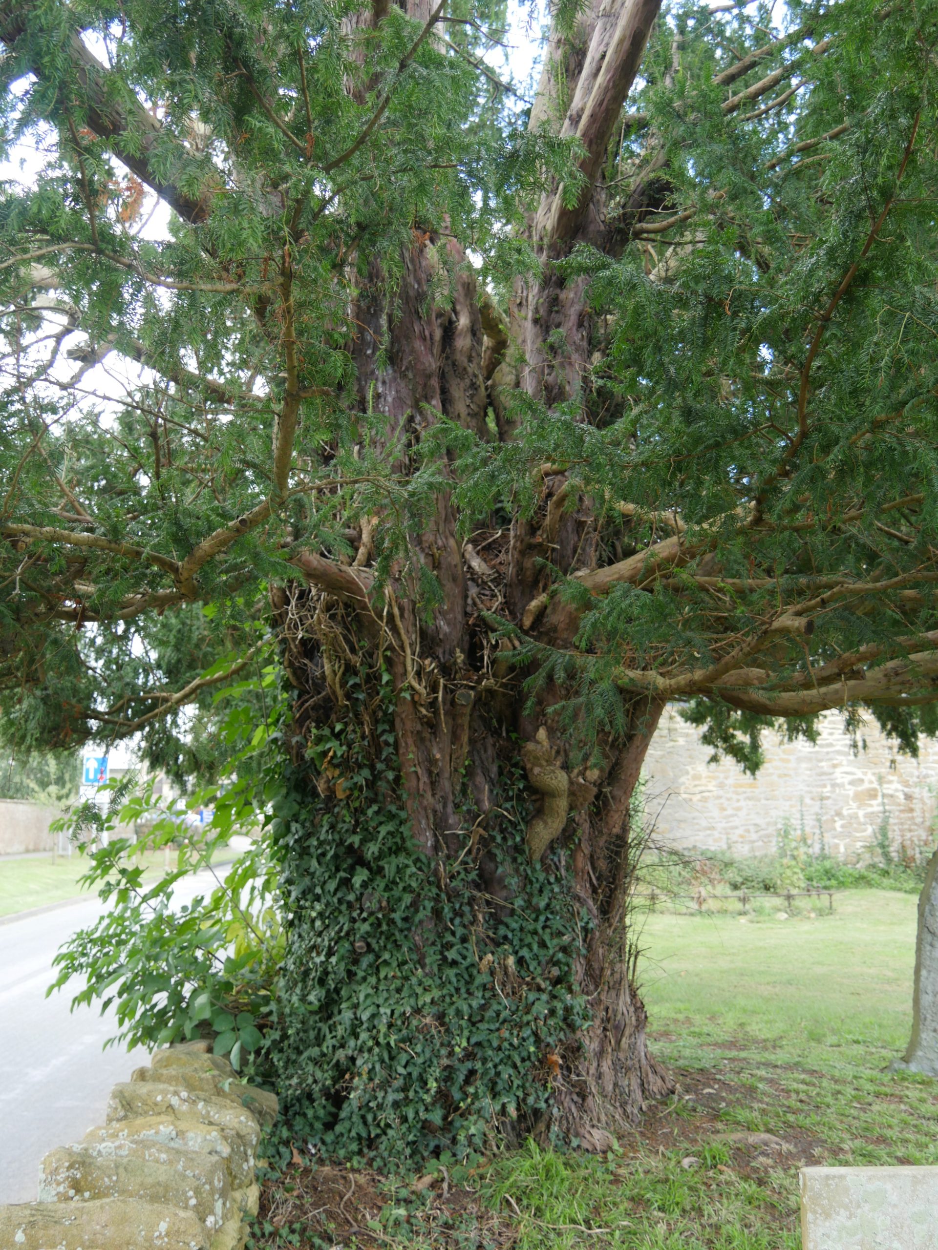 Notes:The largest girthed yew, above, grows due north of the centre of the church and close to the wall separating churchyard from road. Foliage was sparse on the end of thin branches. This is possibly the result of the tree competing over decades with much ivy, which has now been removed so that it no longer fills the branches. Girth was 14′ 6” (442cm) at a height of about 2′ 6” – above the thickest ivy stem.