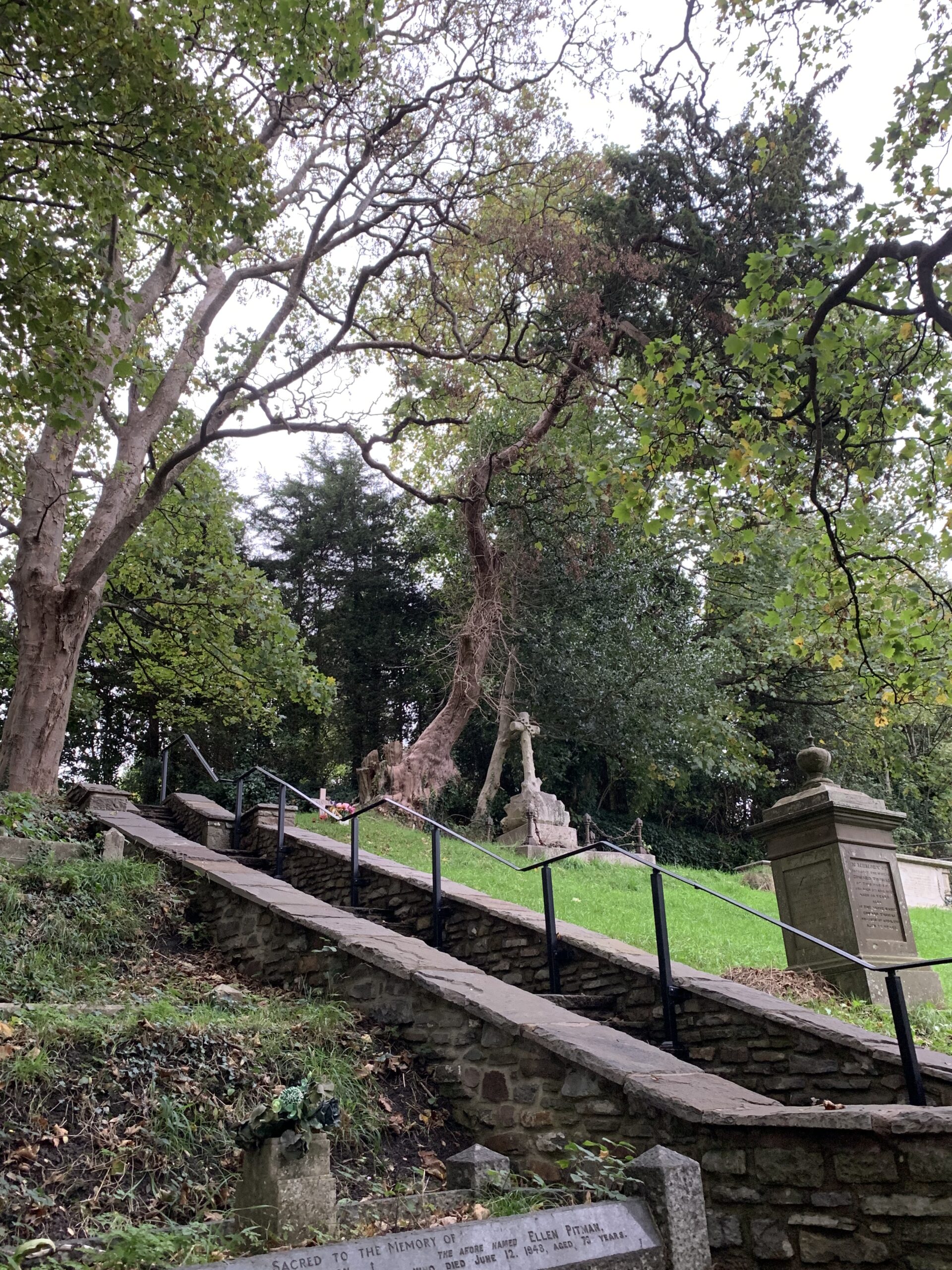 Notes:1998 – Tim Hills: Other trees are crowding out what is left of this yew. Two very straight and tall branches grow from close to the ground, while what was probably the main branch has been removed. Girth will diminish when the stump has decayed. There were signs of fire/smoke damage. A girth of 19′ (579cm) was recorded in Meredith’s list found in The Sacred Yew by Chetan and Brueton -1994.