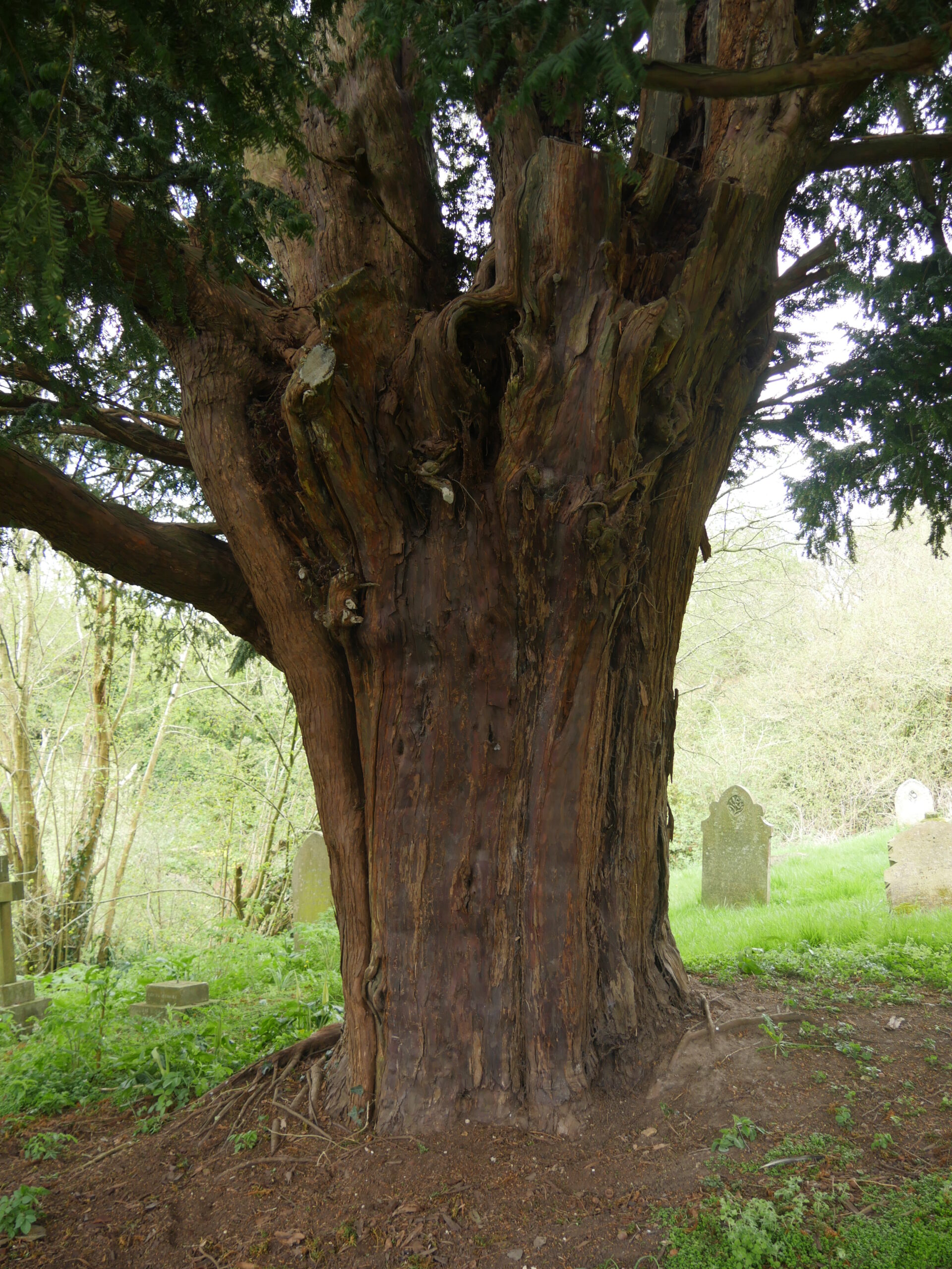 Notes:May 2016 – Tim Hills: On the yew’s west side is a gash revealing internal growth and decaying heartwood. On the east side is a section of several feet where the bark characteristics are clearly different from the rest of the tree. The tree has undoubtedly looked quite different in the past. There are signs of much cutting back at a height of 8’/10′. Girth was 11′ 11” (363cm) keeping the tape 1′ above the sloping ground. A girth of 11′ 9” (358cm) was recorded at 1′ and 12′ 4” (376cm) at 3′, both measurements taken above the higher ground with a horizontal tape.
