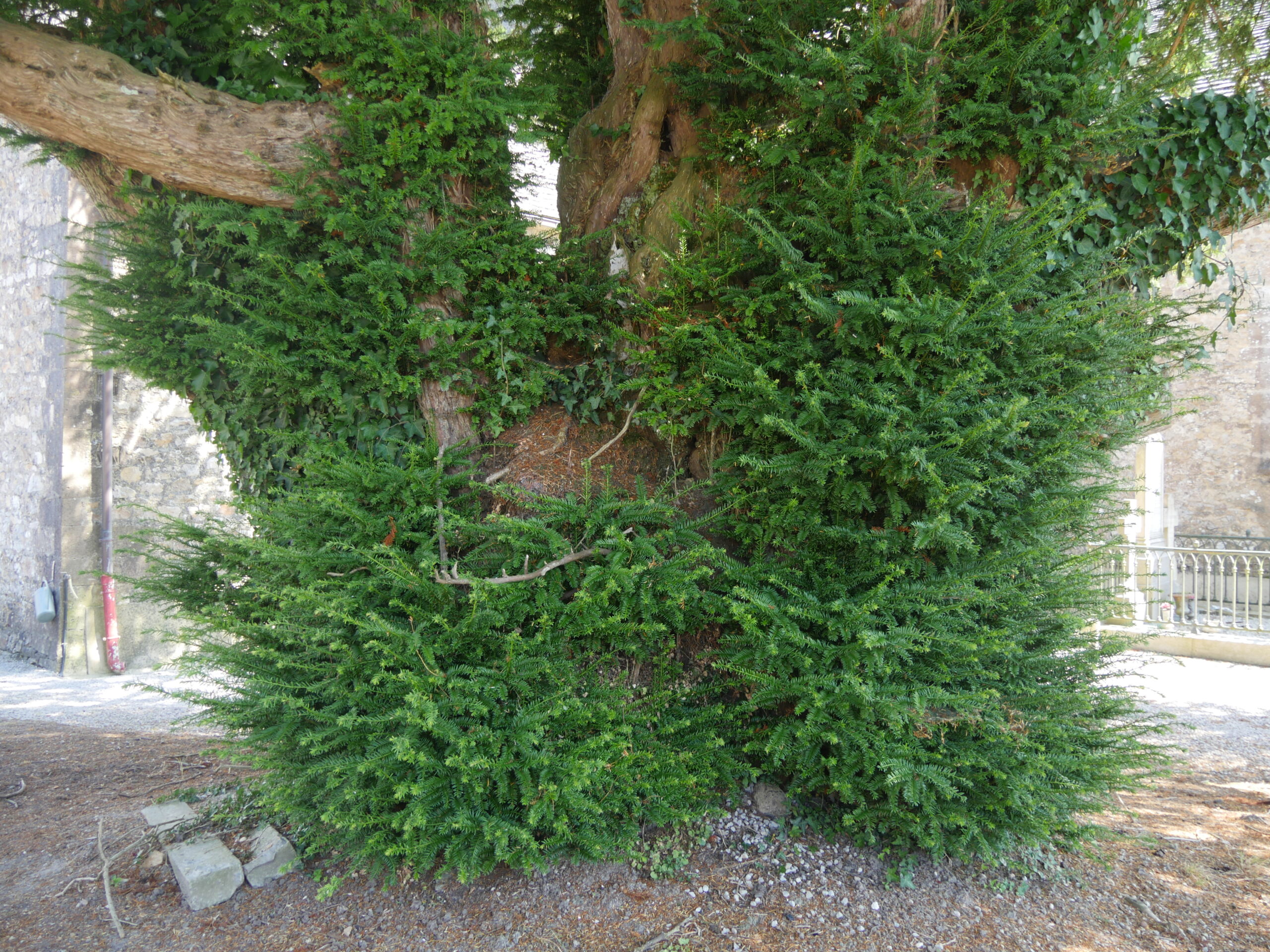 Notes:Wim Peeters: The tree consists of a stem with many small branches, making measurement difficult. At 1m are several branches, the lower of which have an open appearance with low needle density. The ascending hollow stem splits at 3m into several upward branches. Ivy has been allowed to grow into the crown. In the past several ascending branches with a diameter up to 30 cm have been cut. A plate by the tree warns about its poisonous berries (arils), but not a single one was seen on this August trip, a time when a female yew is usually covered in the red fleshy fruits. The local Council of Architecture, Planning and Environment (CAUE de la Manche) gave it a girth of 8.40 m on the 19th September 2009. In the 1894 Bulletin de la Societe Linneennne de Normandie p 97 – 99 is the following: In the cemetery of Brix, (10km south of Cherbourg) is a yew, of which the stem, 1 metre above the soil, measures 5,15 m of girth of which the top, reaching to the church roof, shades a circle of 16 a 17 m diameter. At 1,50 m above the soil, the stem splits in three large branches. Deeply embedded in the bark, are pebbles that were perhaps launched by children centuries ago! Altitude above sea level is about 145 metres and the rock type is quartz sandstone.