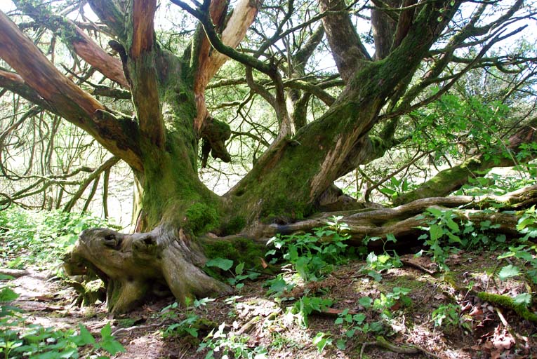 Notes:Here is an old moss covered male growing on top of the steep bank overlooking the path which also forms part of Broughton, Buckholt and Nether Wallop parish boundaries. It has the appearance of leaning to one side with two main trunks and possibly a third. On the south side its roots spread sinuously across the top of the bank. Foliage was sparse and the bark has peeled away in many places. The girth was measured at the lowest point possible but the 13′ (396cm) recorded can only be treated as a guide.