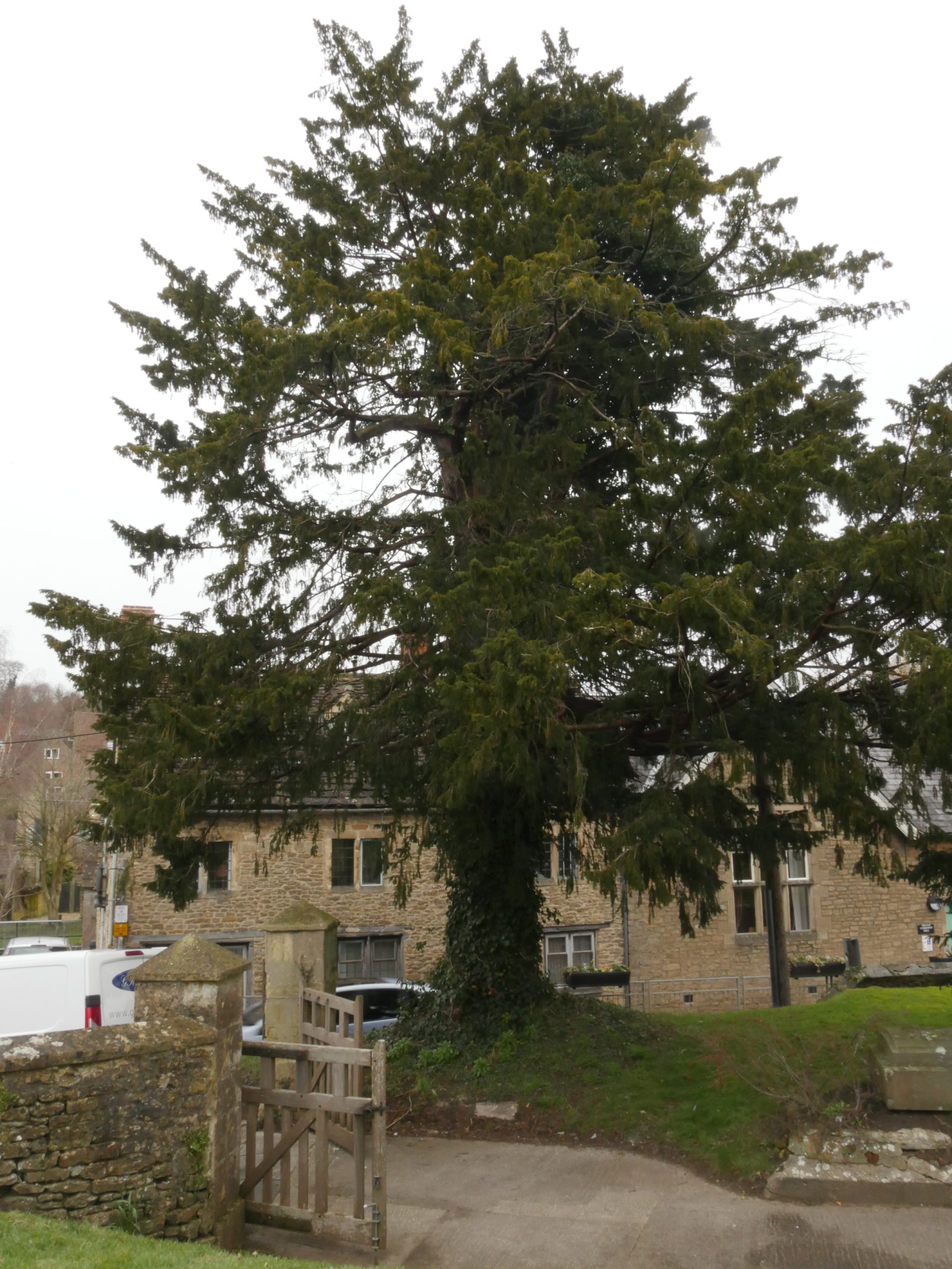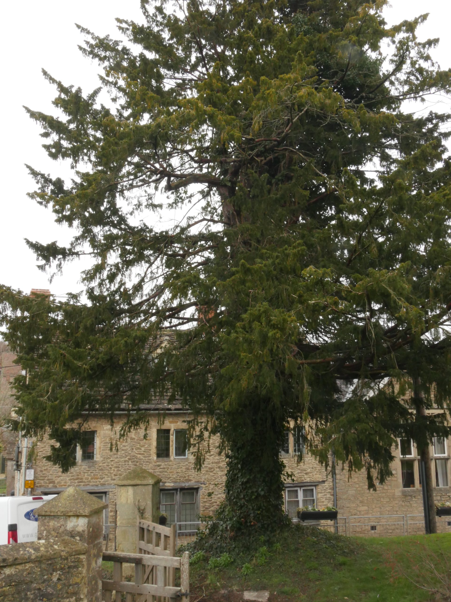 Notes:Five yews grow here and the tree noted in 1836 must be tree 1, at the west gate. Since its girth suggests a present age close to 300 years only, the word ‘venerable’ must refer to it being venerated rather than to it being especially old. Today that tree, male, is ivy covered and growing on a slight mound. The ivy will increase its girth by several inches and I recorded 10′ 11” at 2′. Beneath the ivy is a fine straight trunk.
