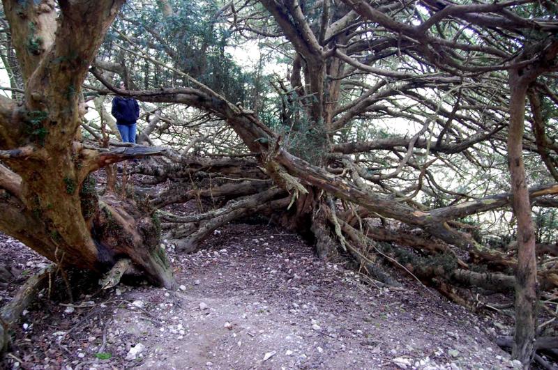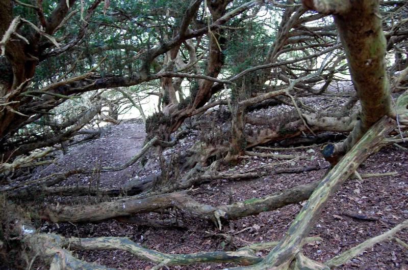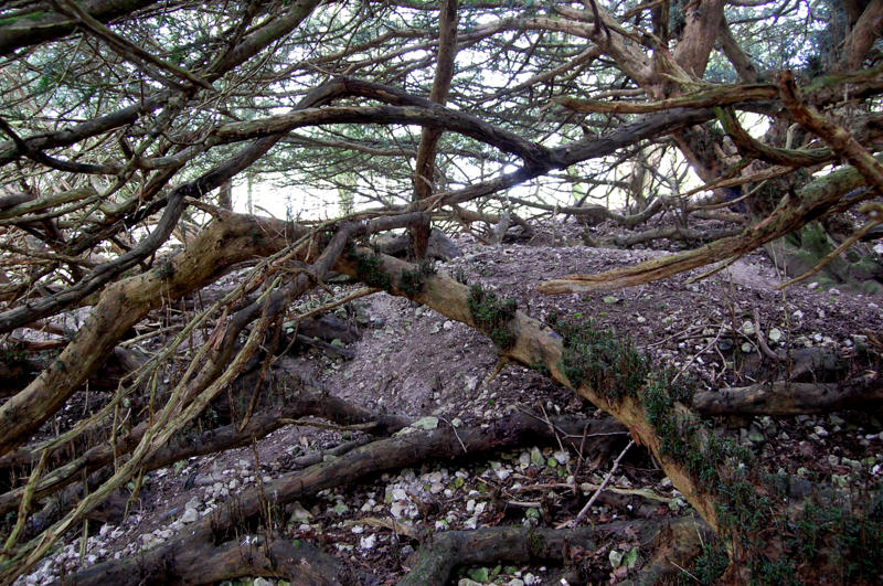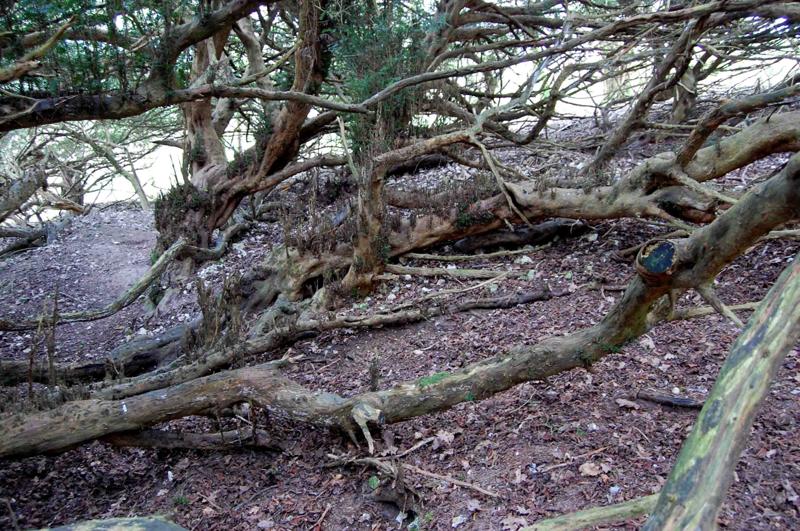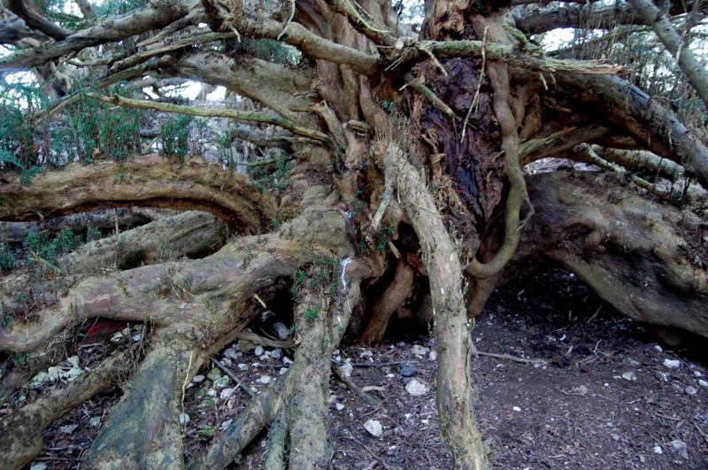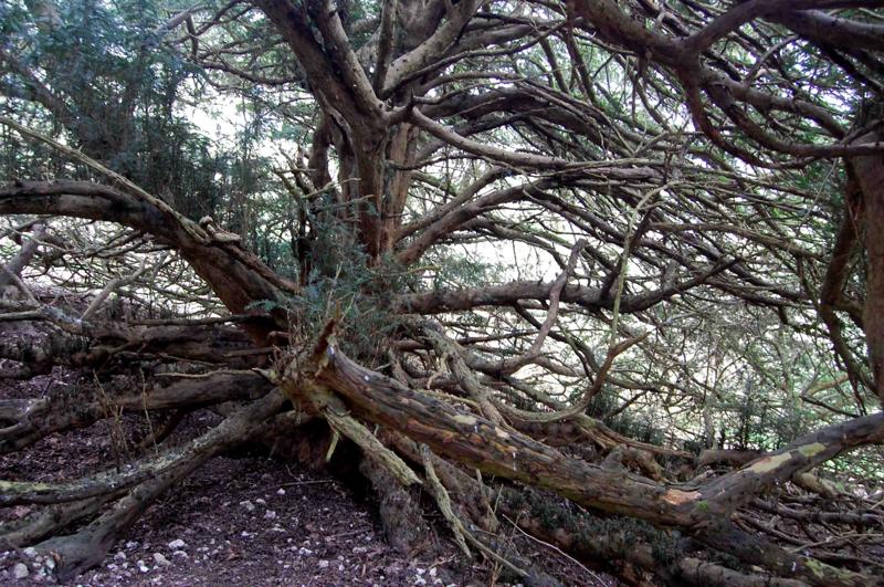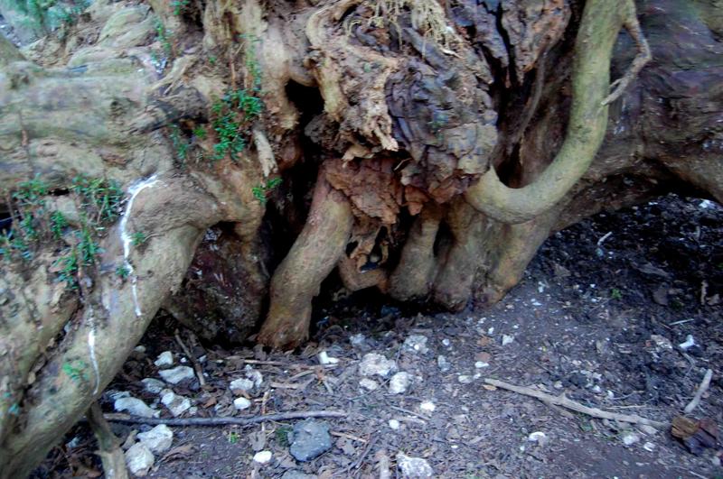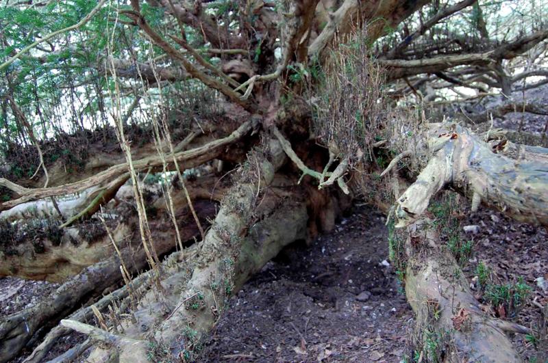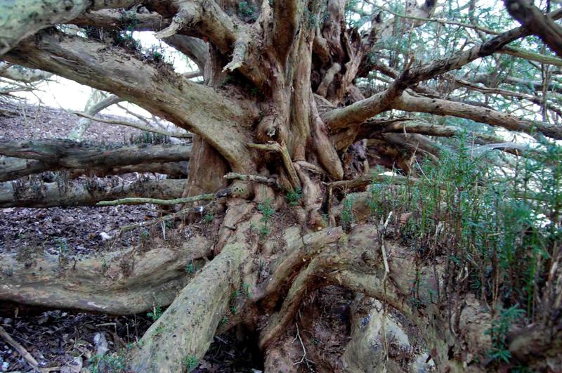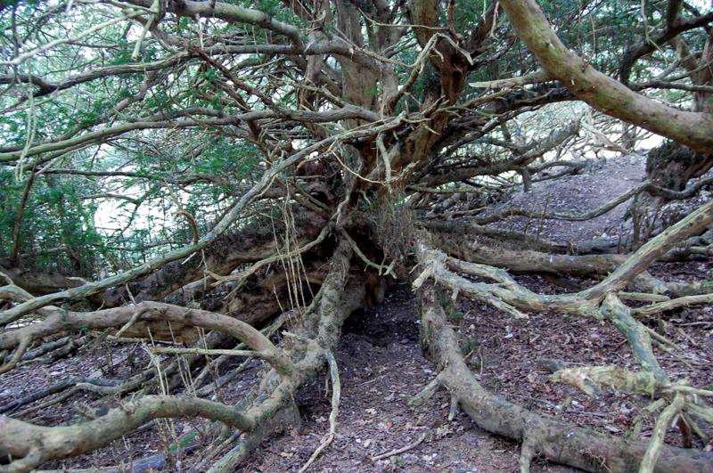 Notes:Peter Norton:This resembles no other yew I have seen and has the ‘Wow’ factor. There is a gap on the west side and stepping inside the lack of height of the main trunk is evident. The lower branches have layered and on the south east side a substantial tree grows, still joined to the main trunk. The north side of the tree shows what were once internal roots along with a loss of the outer trunk. Badger activity is burying many lower branches. To move around beneath this yew required clambering over and under large branches.