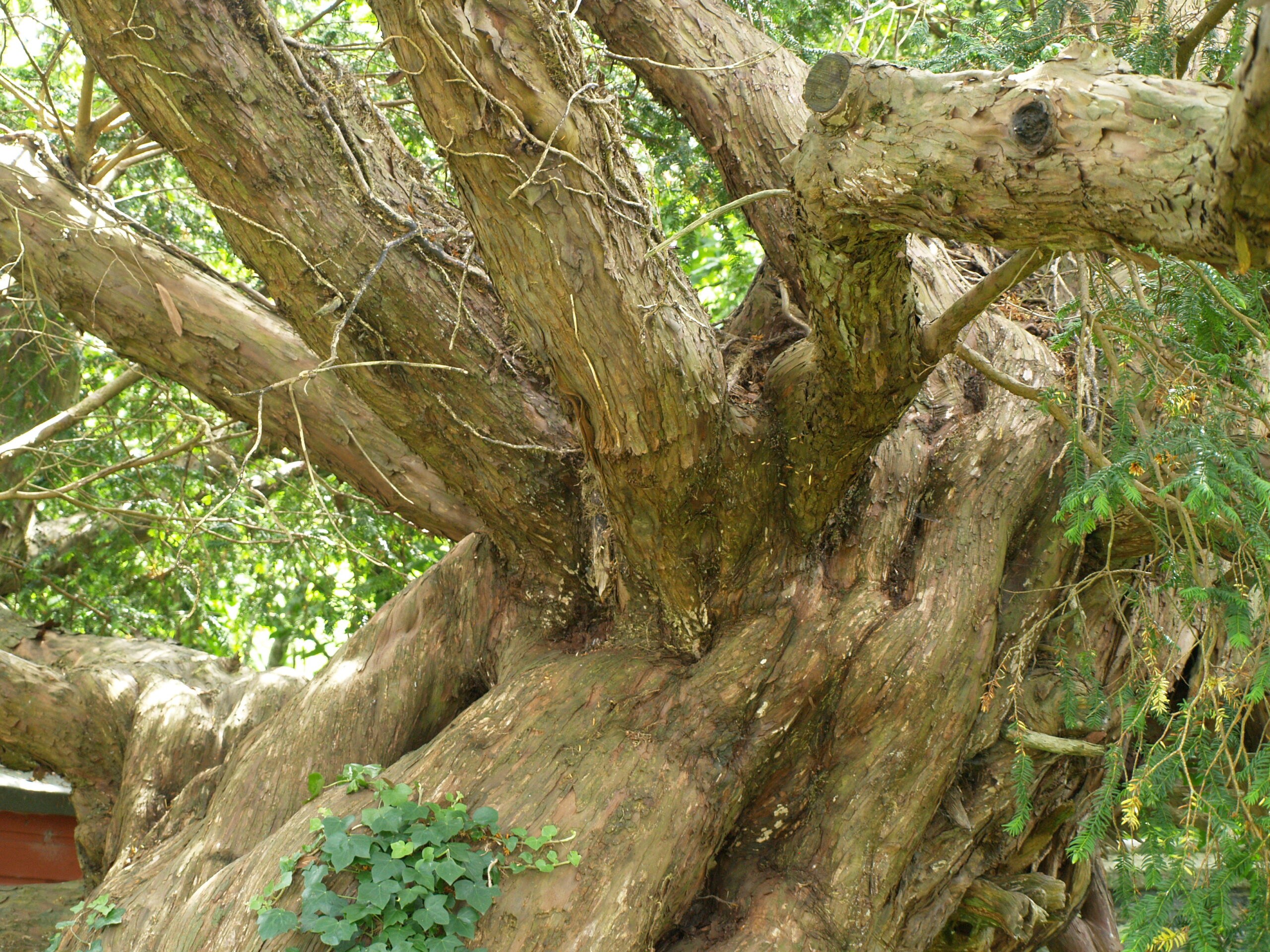 September 2014 – Peter Norton: Of three yews that grow here, the significant one is close to the southeast perimeter corner. It is a hollow and fragmenting female yew, still propped, although two props lie on the ground. It is now screened by alder and holly.