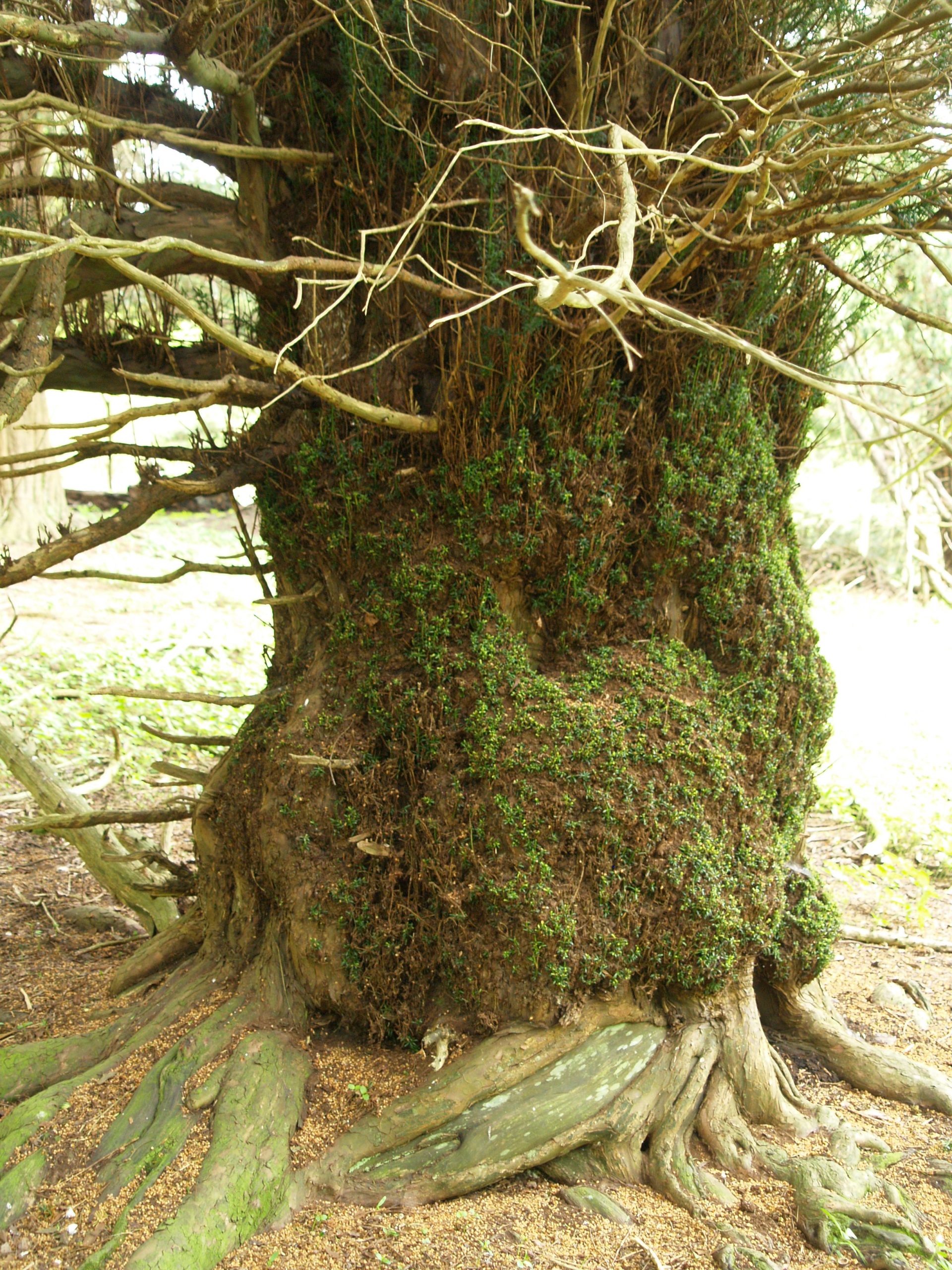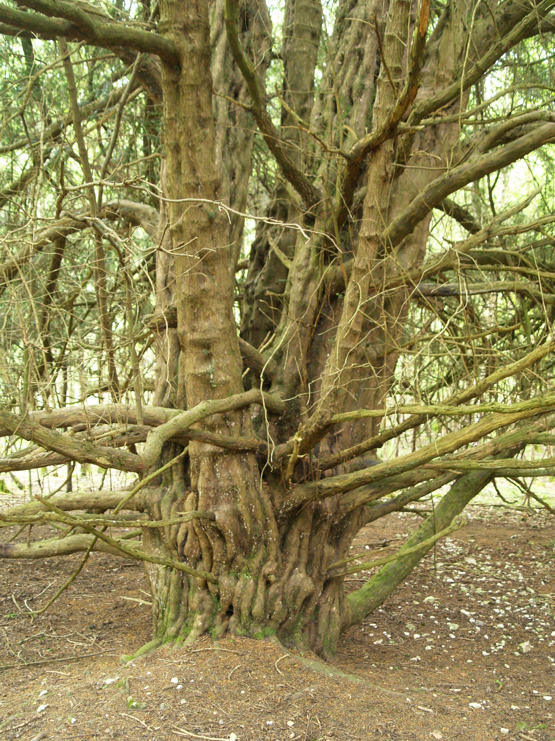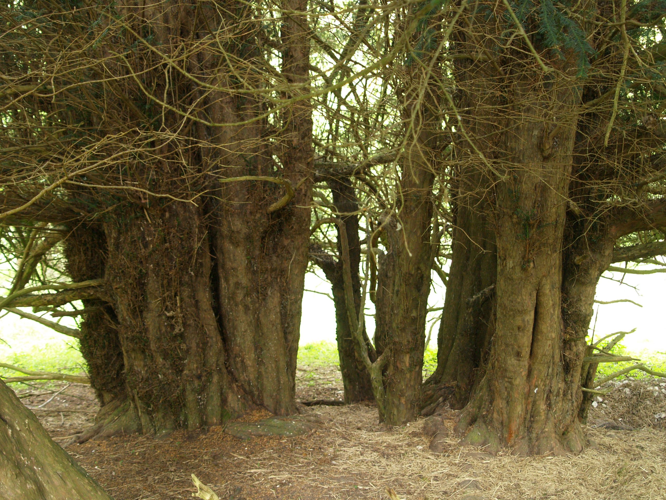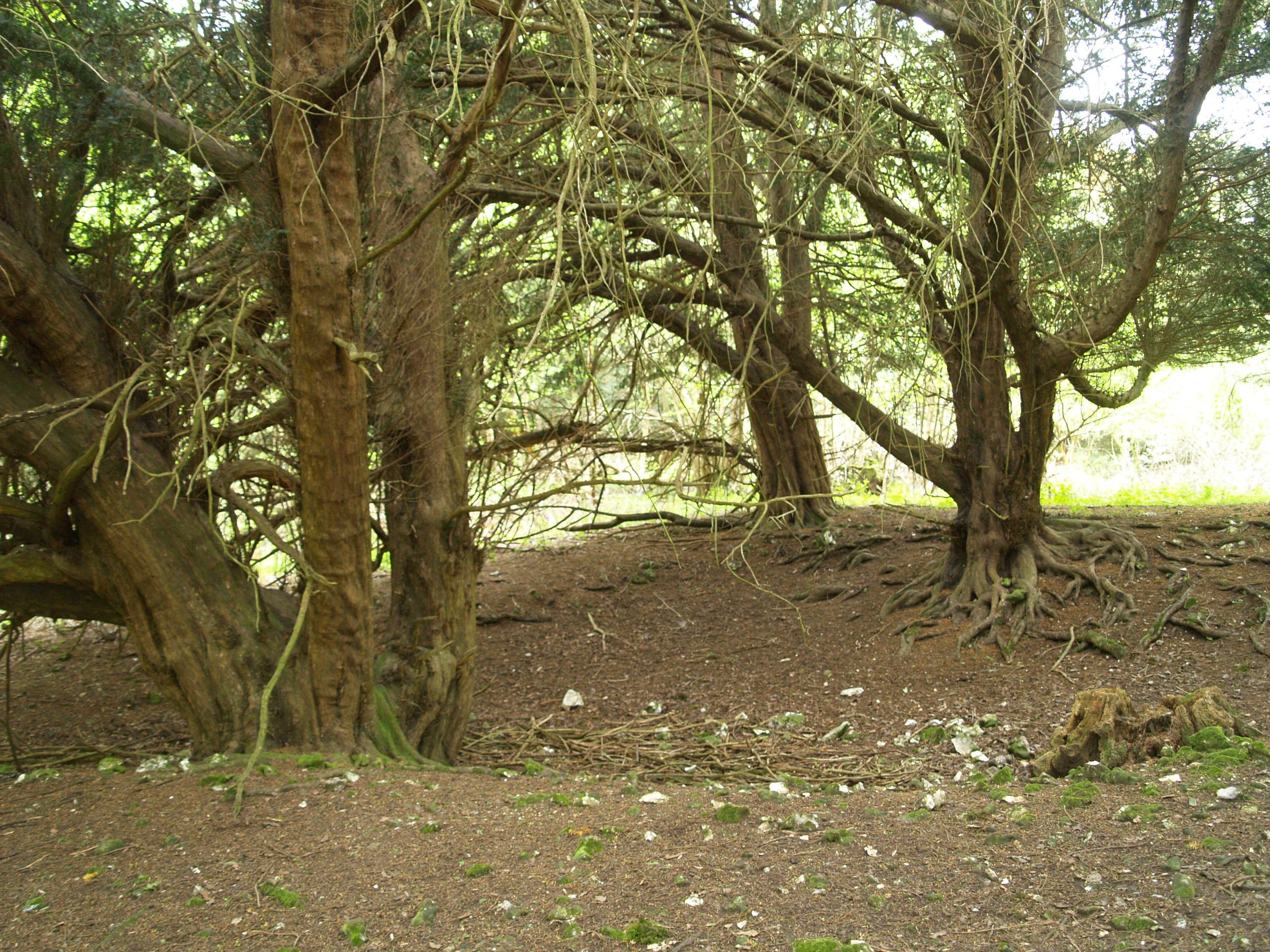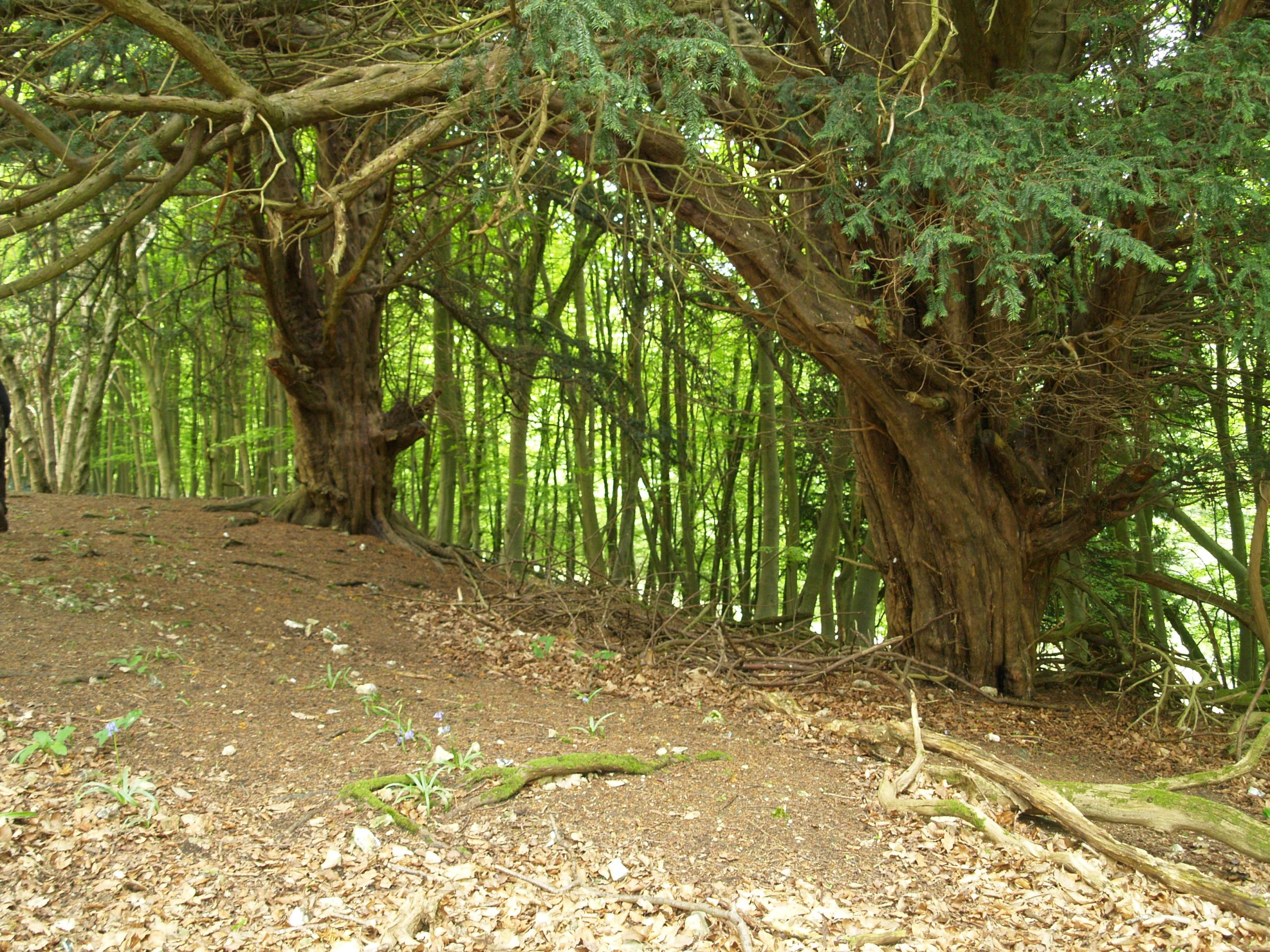 Notes:They yews were photographed but not measured. There are thought to be 50/60 individuals in this old woodland. A variety of yew forms with the largest girthed in the 10’/13′ range. One circle of trees appears to have been deliberately planted. Several grow along an embankment and others grow around a dip in the ground – possibly a chalk pit.