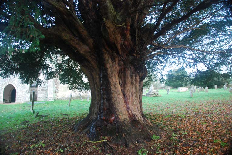 Notes:Twelve yews grow within the churchyard. The most notable, seen here, is female with a girth of 11′ 7” (353cm) at 1′ and 12′ (366cm) at 3′. It grows opposite the southwest porch. Two male and two female yews grow along the pathleading from the northeast entrance and into the churchyard. Around the curved eastern perimeter grow a further seven unmeasured yews, of which four are female and three male.