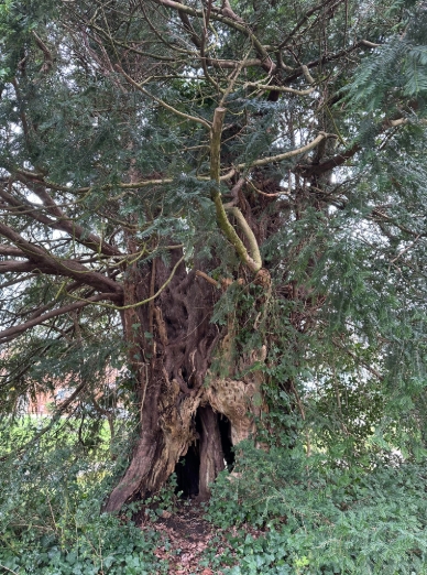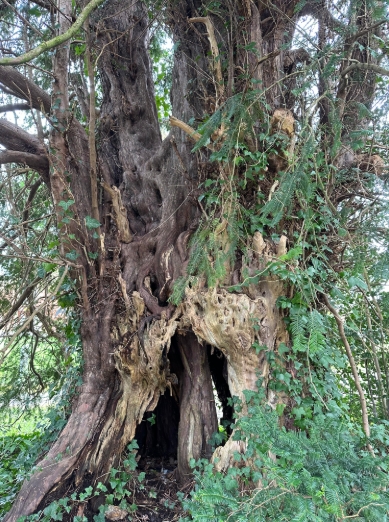 Notes:A fine yew, with a hollow revealing internal growth. Girth of 594cm at 135cm recorded by Rhiannon Hay (Woodland Trust volunteer) in 2024