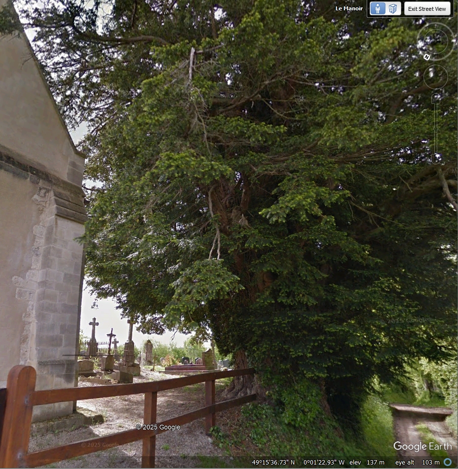 Notes:In Arcisse de Caumont’s 1857 Statistique monumental du Calvados, vol 4, p93/94 he writes that ‘an enormous yew displays its roots at the side of the road and covers with its numerous branches a part of the churchyard. The yew has a girth of 5 metres in the middle.’