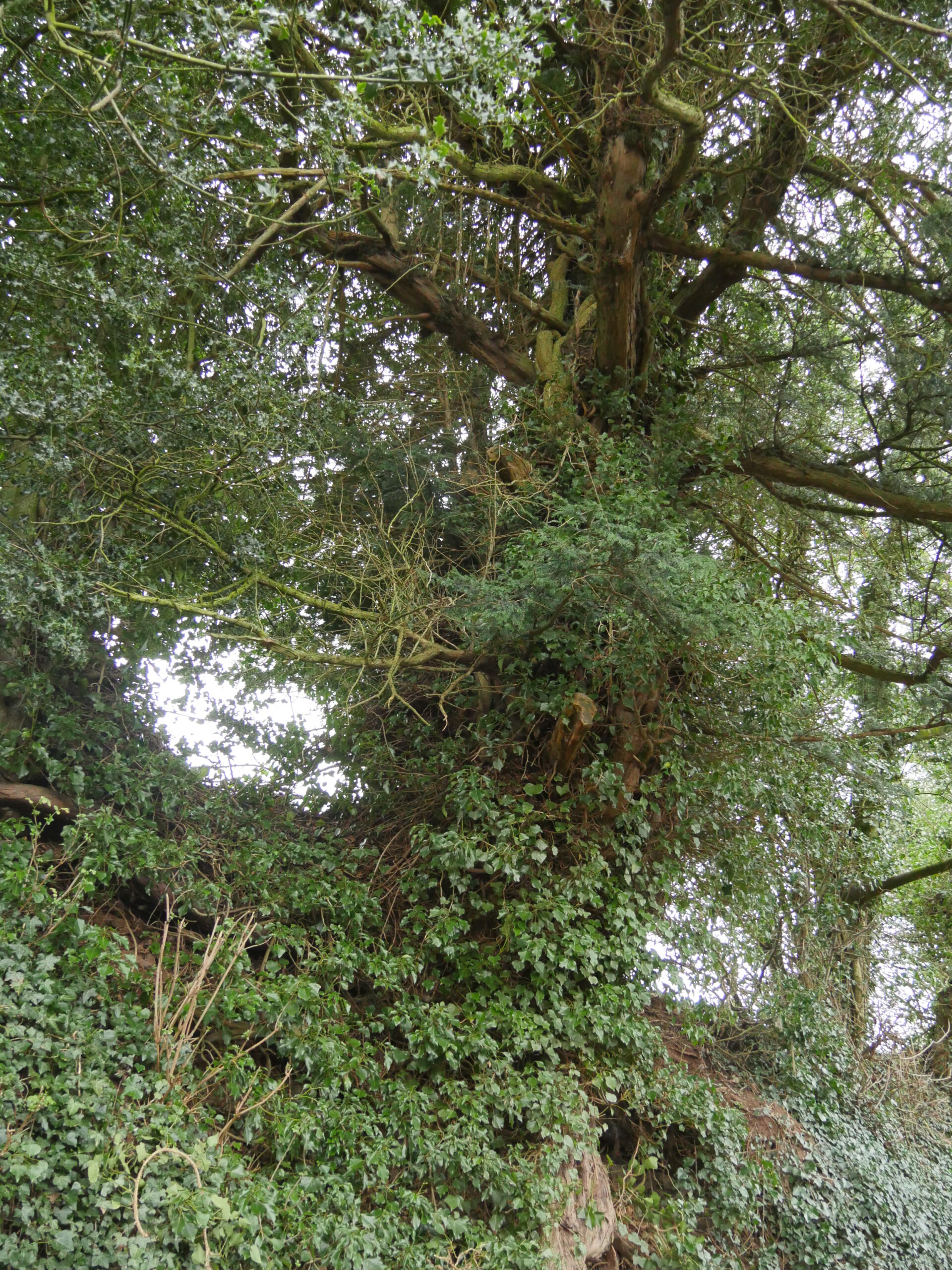 Notes:Tree B on the plan is by far the largest of the three yews. It appeared to be about 20′ in girth and grows at the top of an almost vertical drop of about 12′ to the road. This space is filled by an enormous root that reaches from the tree’s bole to the road.