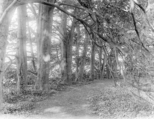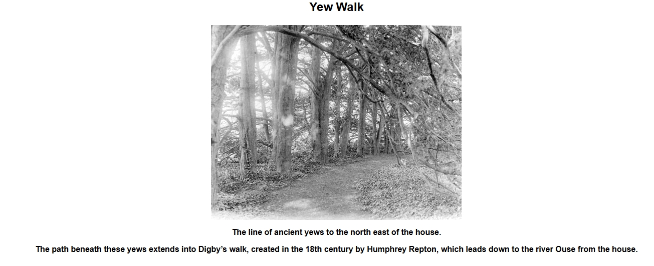 Notes:In Notes and Queries 1913 there are described “several clumps of yew trees which must be several centuries old; in the clump NE of the mansion is growing the largest of these trees.” An expert from Kew had aged the trees at 6 centuries. In 1913 girth at 3 feet was recorded as 162 inches (13′ 6”). The only available pictorial record of yews here is that of Digby’s Walk.