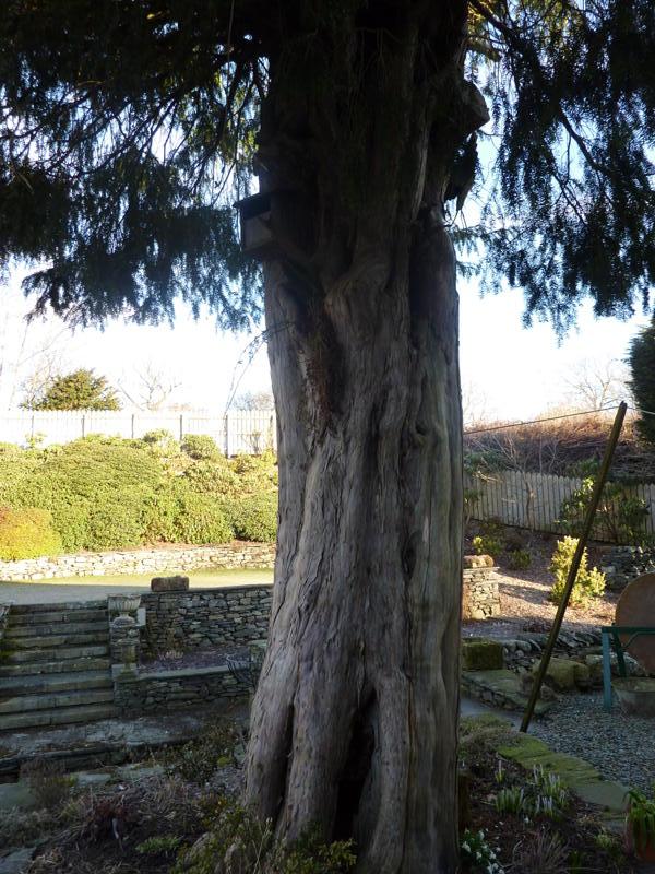Notes:Although this pair of yews are of similar girth, the specimen growing in the garden has already become hollow, with internal growth. Both trees would be classified as V-con, namely veteran because of their condition.