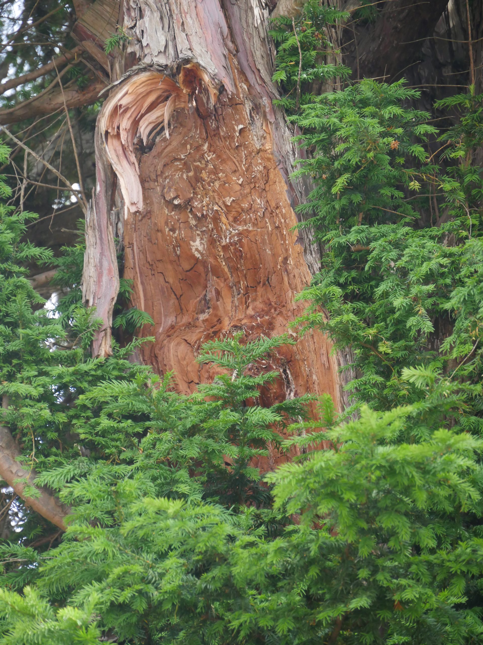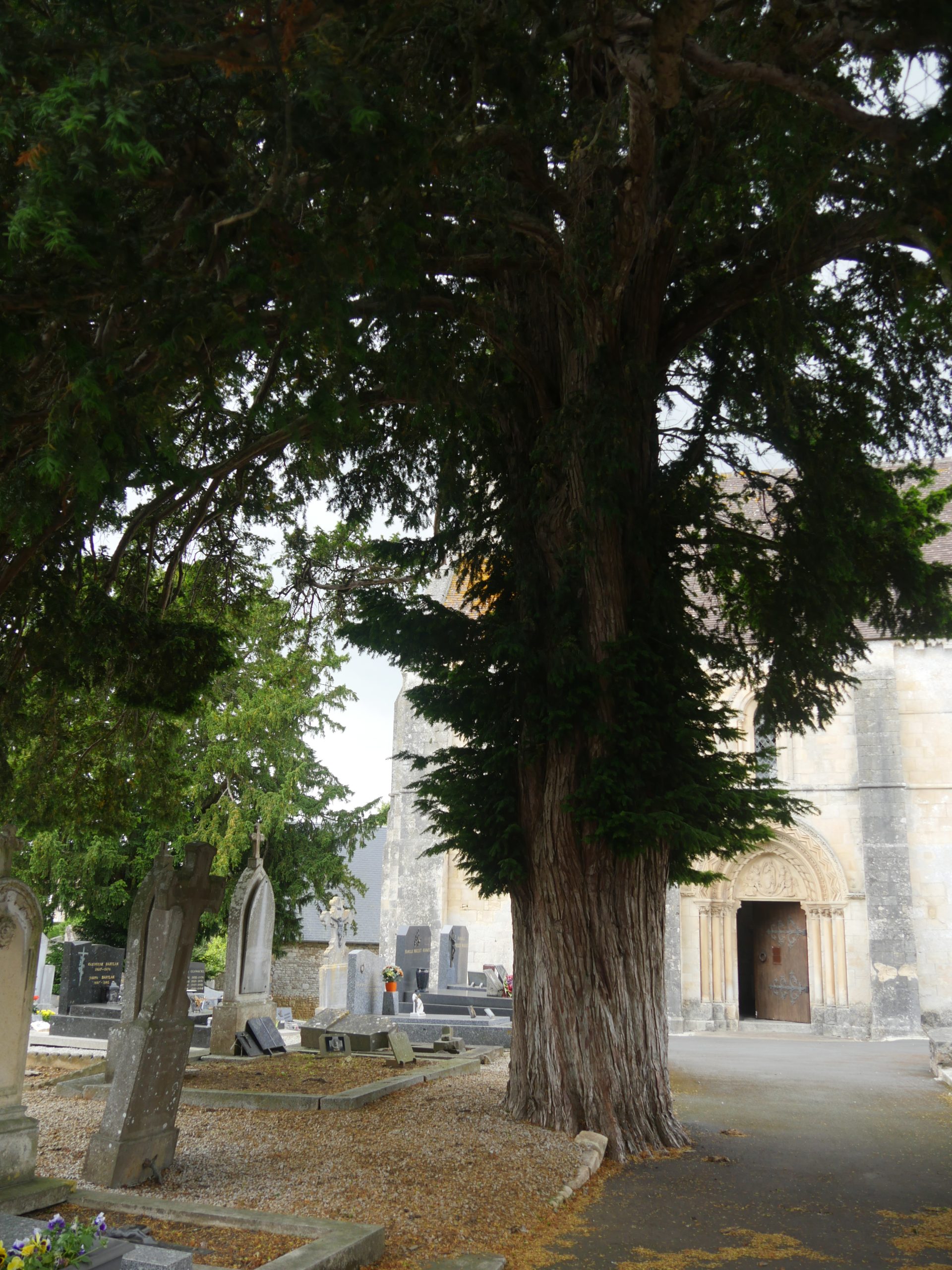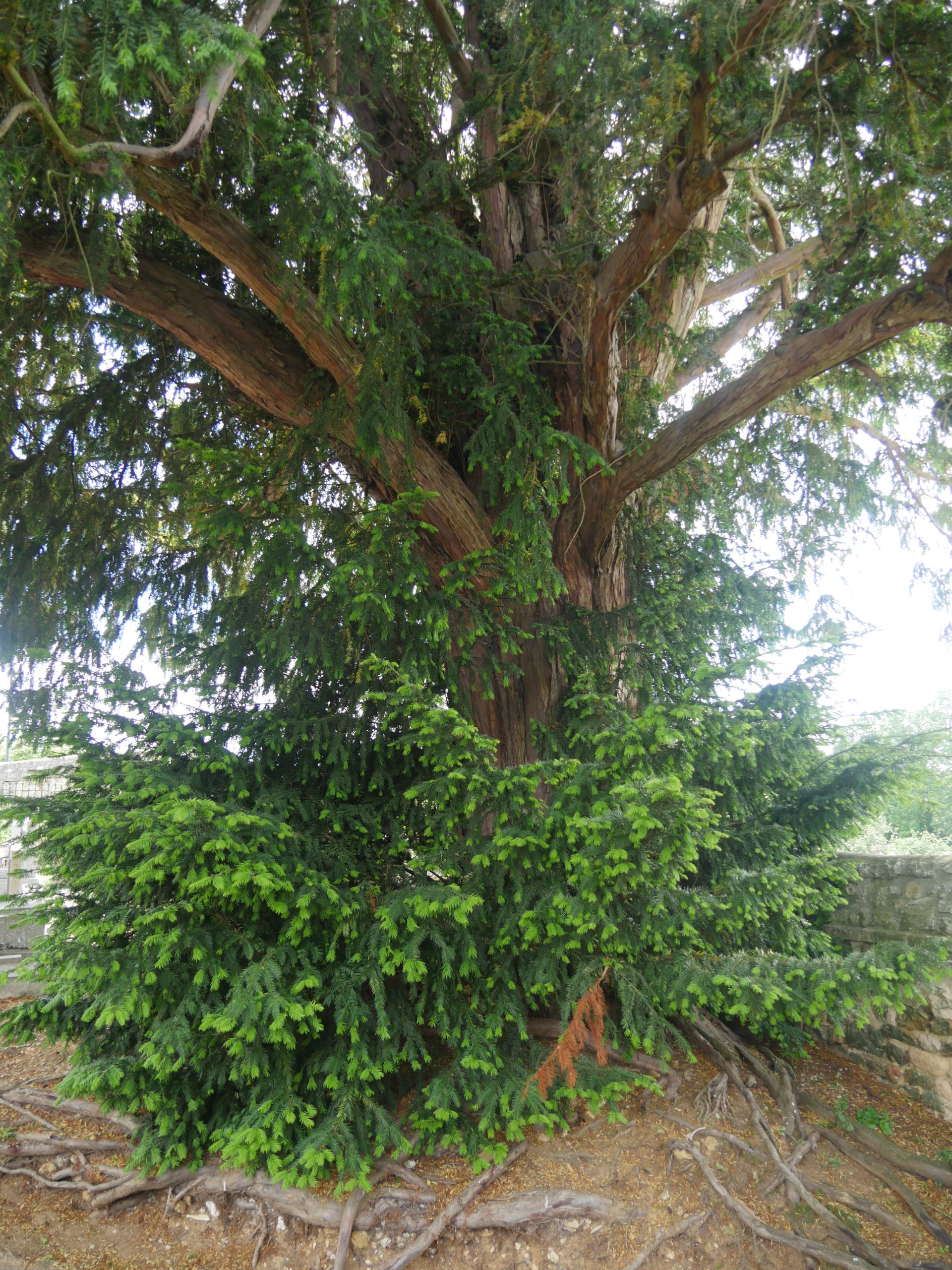 Notes:The female grows south of the church. Girth was 11′ 1” at 3′ above the path. It appears to be a solid and strong tree, but with one broken branch visible. Its long straight stem divides at 20′ into two rising branches with much lateral branching. The male is seen in the final photo. It was unmeasurable behind twiggy growth, but might have been a similar size.