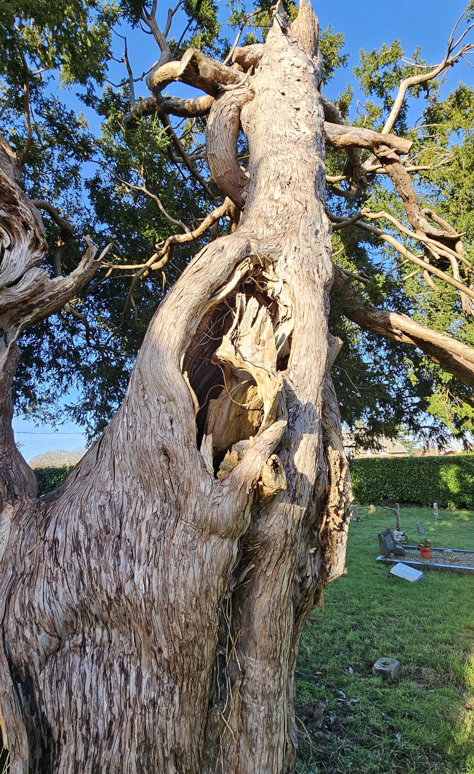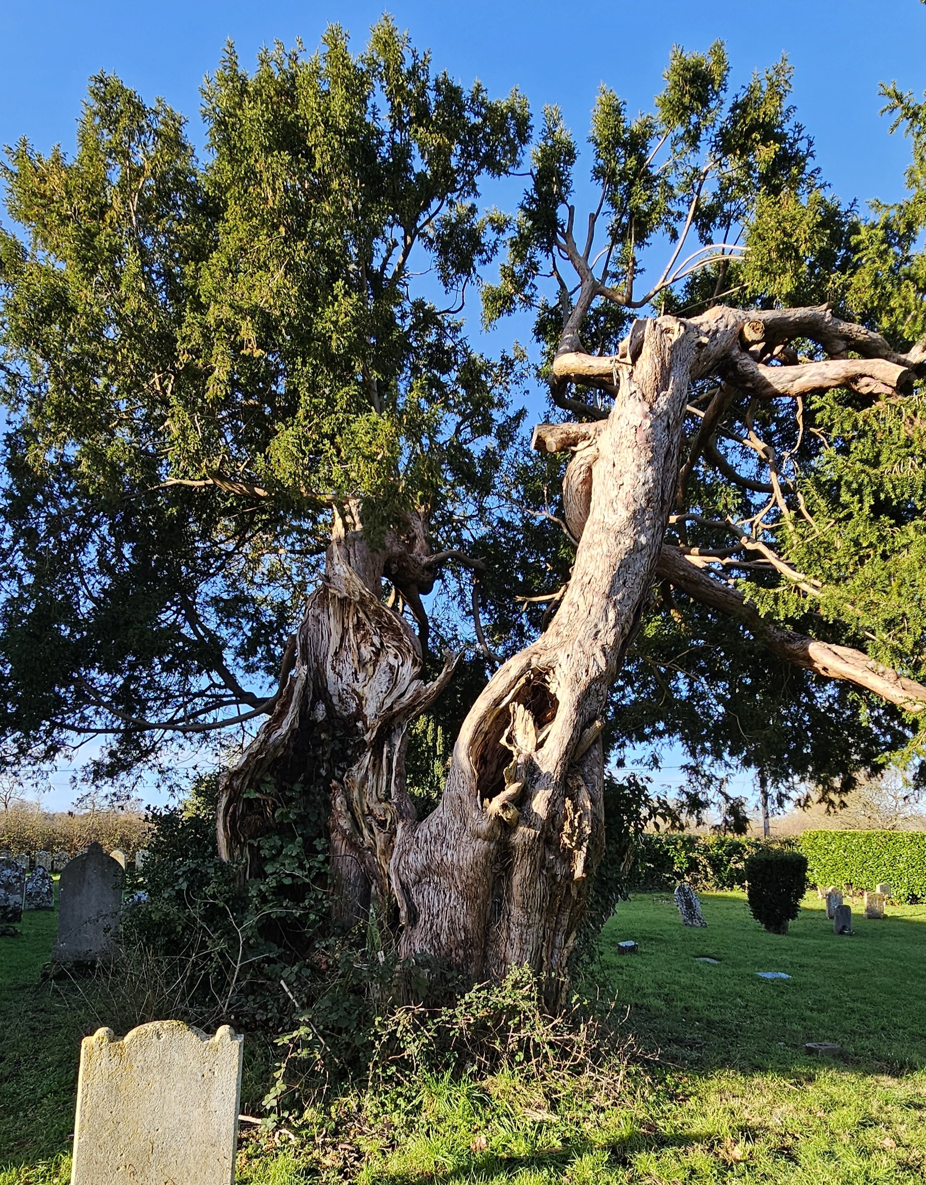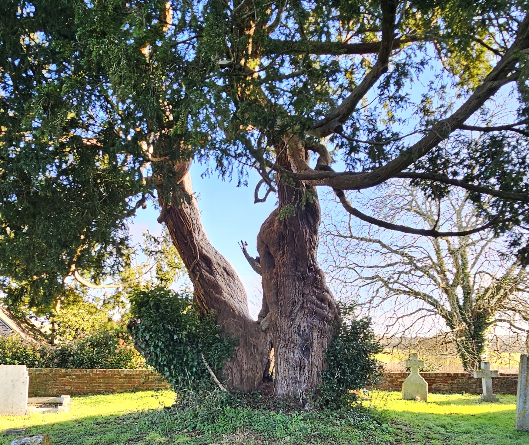 January 2026 Peter Norton: A twin-trunk female yew is found on the north side of the church. As you approach it appears healthy and well. Looked at from the east side reveals much hollowing within its two trunks, right up through into the canopy which is also appears quite sparse from here.