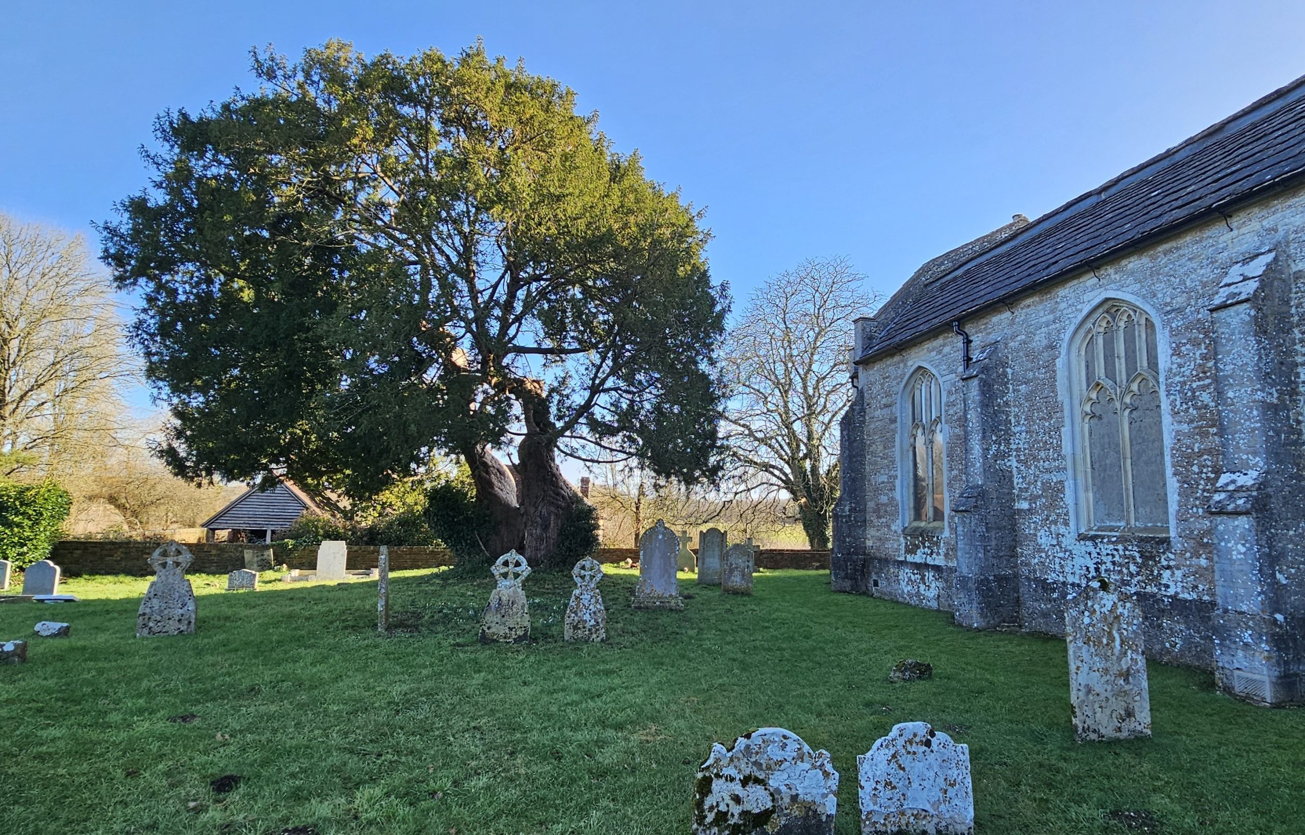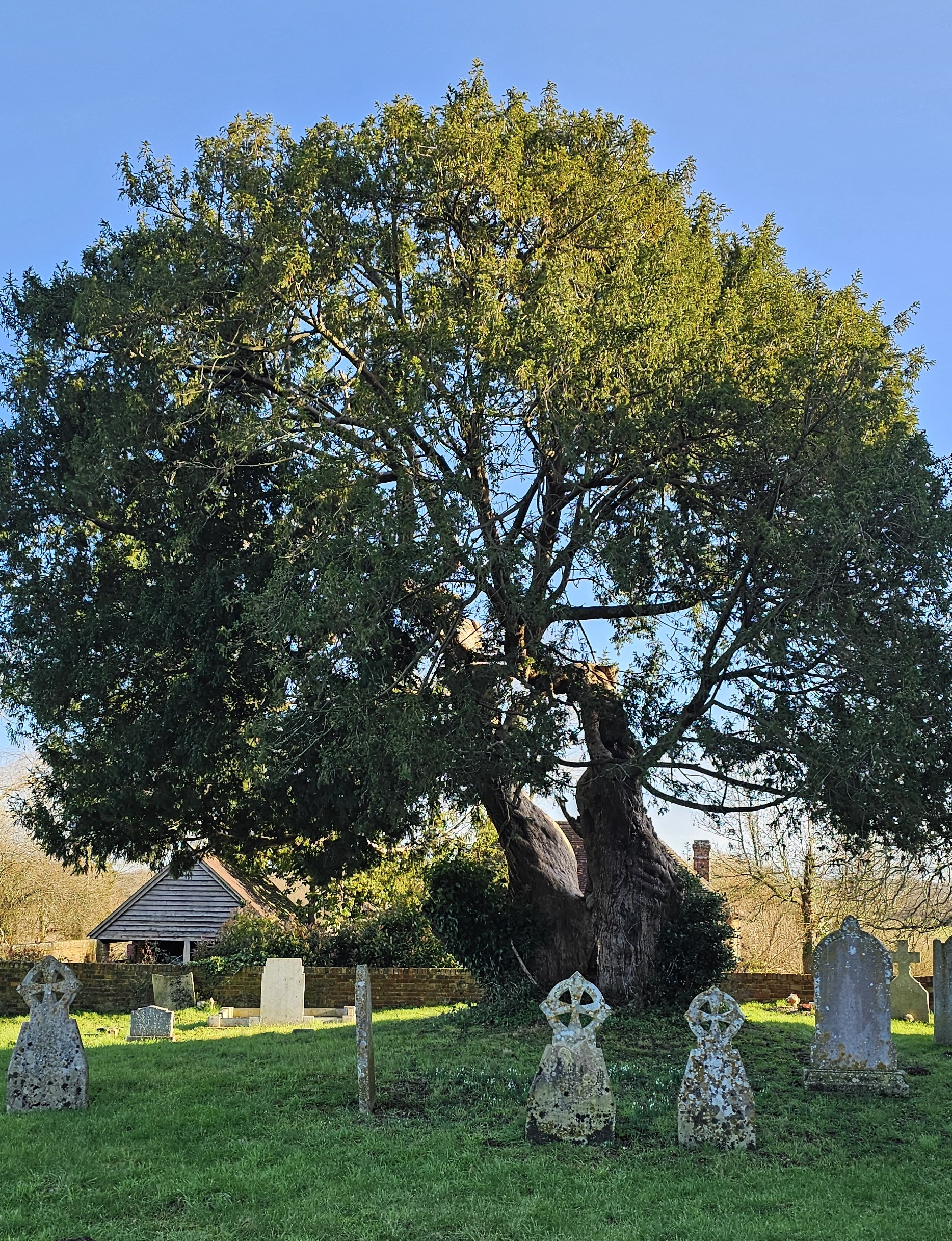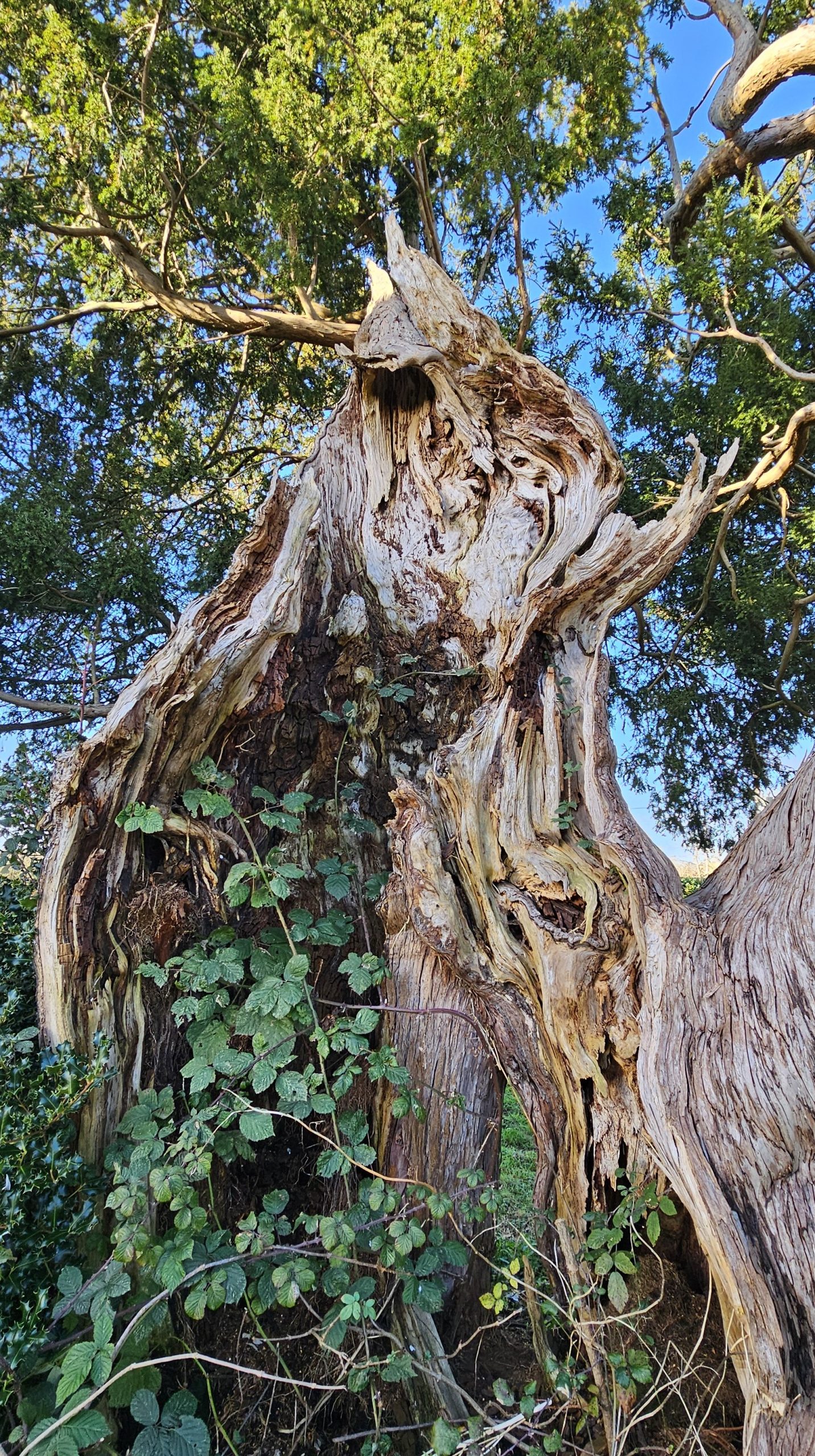 January 2026 Peter Norton: A twin-trunk female yew is found on the north side of the church. As you approach it appears healthy and well. Looked at from the east side reveals much hollowing within its two trunks, right up through into the canopy which is also appears quite sparse from here.