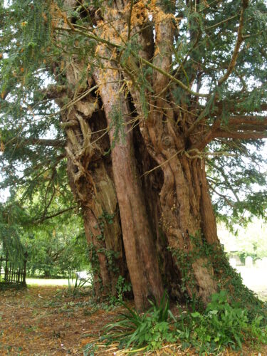 Notes:May 1981 – Allen Meredith: The tree is covered in ivy, most of this I pulled away before measuring. The tree measured 15′ 10” (483cm). What was once described as a little hole, is now quite a large hollow gap measuring 38” across at 4′ and extending all the way up the tree. The single trunk inside the hollow yew measures 37 inches around the girth.
