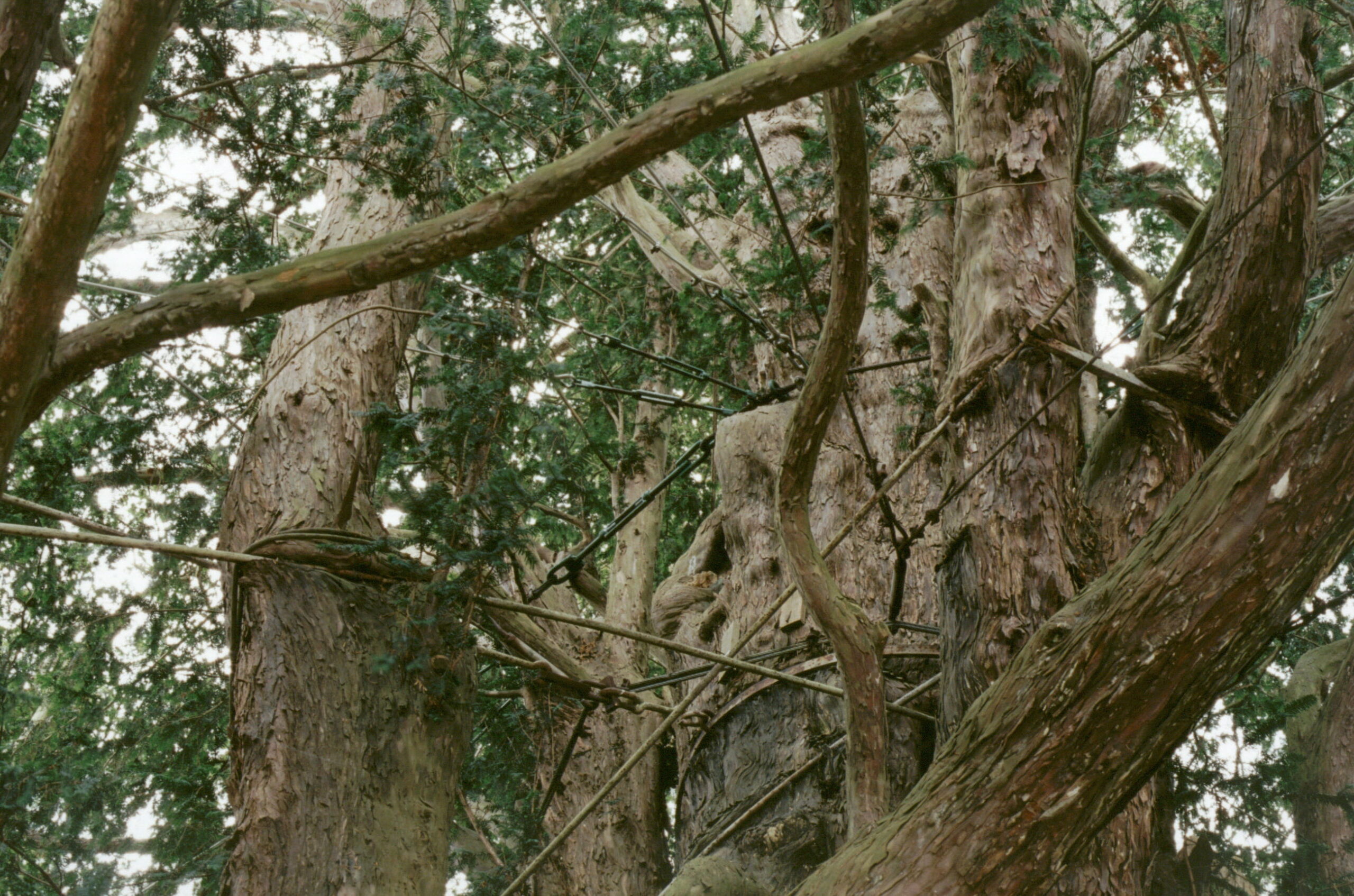 Notes:August 2000 – Tim Hills: The larger of the two yew grows NE of the church and as the photographs show has been made into a waterproof chapel, called the Chapelle Notre Dame. There are many wires and rods to prevent branches from pulling the bole outwards. Girth was 34′ 1” at 1′, rising to 38′ 8” at 5′.