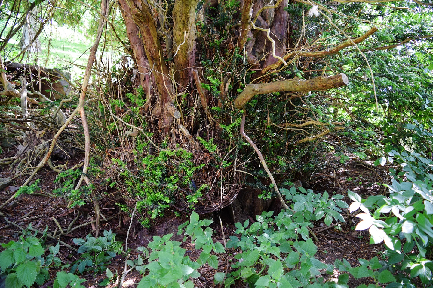 July 2015 – Paul Wood: A male yew measured with difficulty at ground level as 21′ 4” (650cm). Extremely twiggy and multi branched but solid. Of note is the roll of wire that was leant against the tree some time ago and is now unable to move, with the tree slowly swallowing it up.