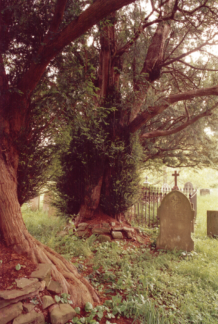 Notes:Middle of the three yews. A small gap is closing and will eventually hide the tree’s hollowness. Thick triggy growth covers much of the bole.