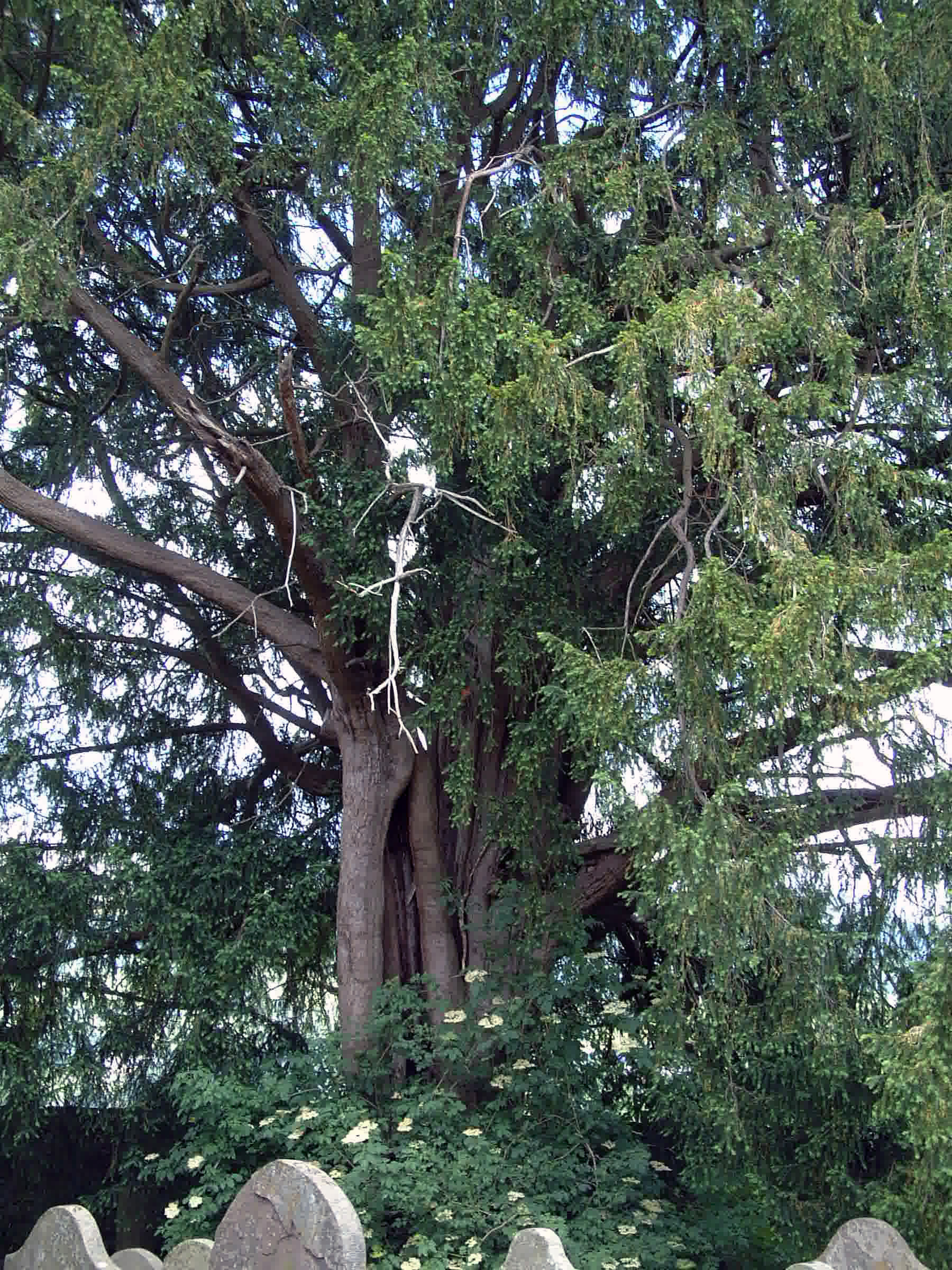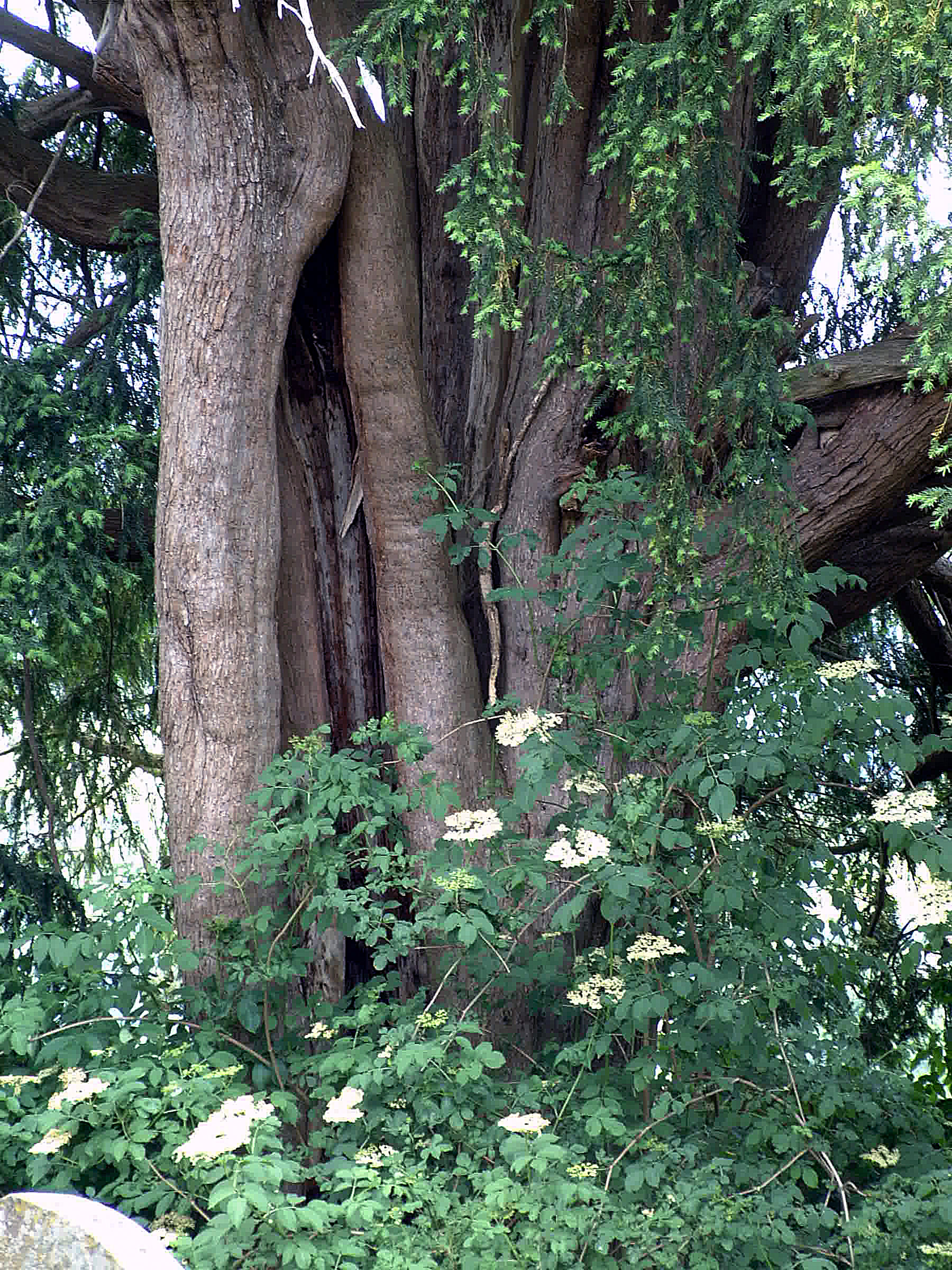 2016 – Paul Wood: White wood is seen inside the hollow along with a number of internal stems of various size. Some Chicken of the Woods fungus was seen on the south side of the yew, which is becoming horseshoe in shape. A grave from the 1700s is embedded in the NW side of the tree. Girth of 16′ 0” (488cm) was recorded at 3′, an increase of 3” in 14 years.