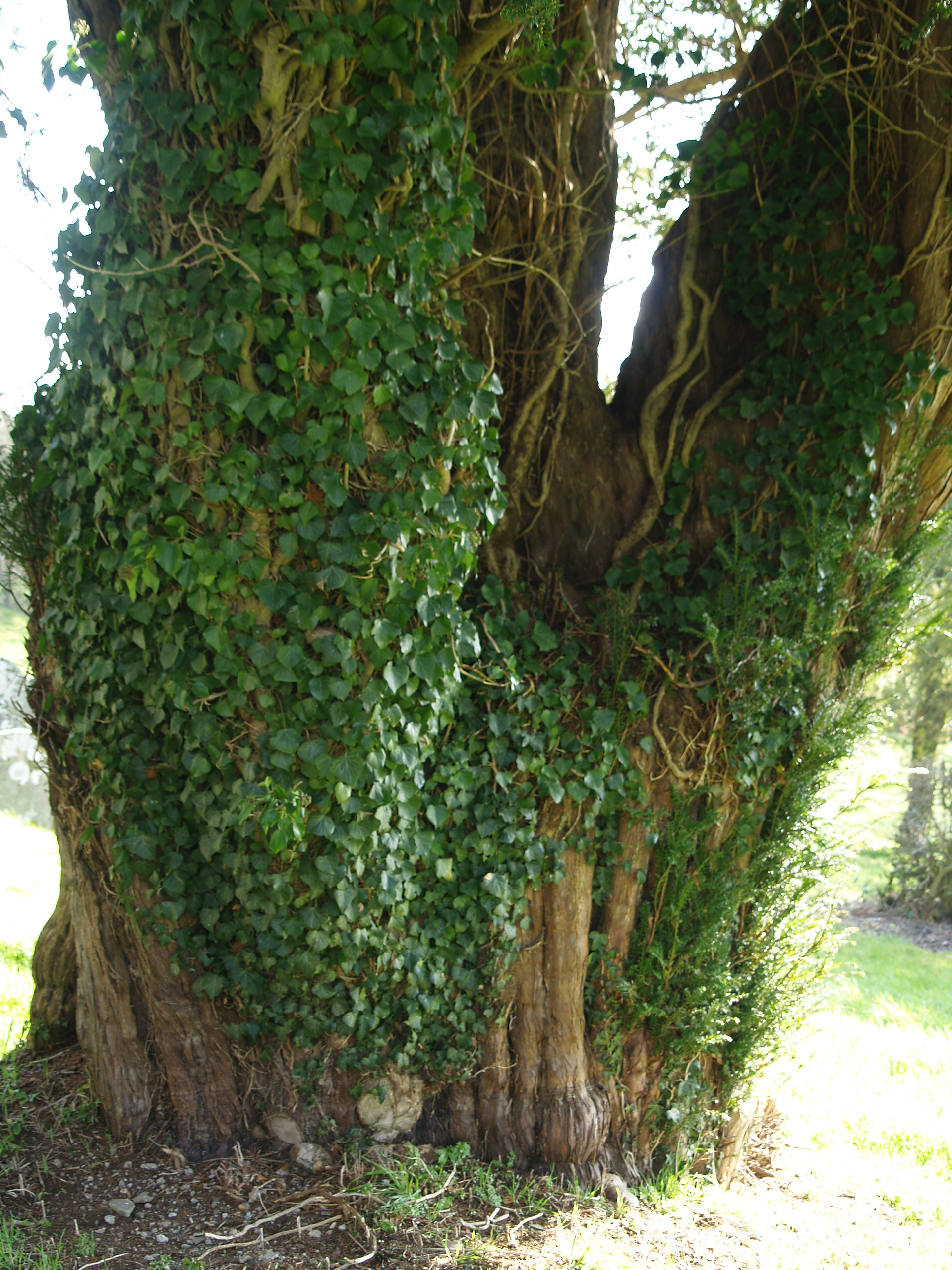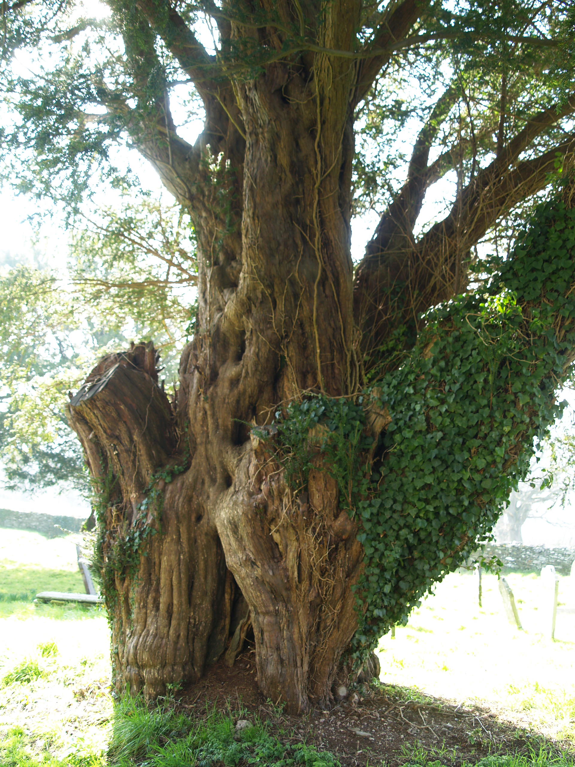 Paul Wood 2016: The yew has become almost inundated with thick ivy and seemed in need of some help. Grass cuttings were being stored beneath the tree – even though only 30 metres away by the boundary wall is an area designated for disposal of churchyard waste. The yew was measured at ground level on the south side of the tree and a girth of 22′ 6” (686cm) was recorded over ivy. Only one small area on the east side, around the hollow opening, was clear of ivy, and a rotting internal stem was visible. Much fungus was noted – the remains of Laetiporus Sulphureus, more commonly known as Chicken-of-the-Woods.