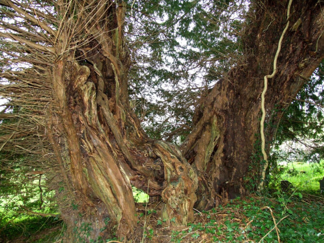 Notes:Fragments of what must once have been a most impressive tree. Drying grasses had built up beneath this and other yews in the churchyard in 2000 and 2005, but had been cleared by 2008. Girth had increased by 3” (between 2000 and 2005) to 24′ 9” (754cm).