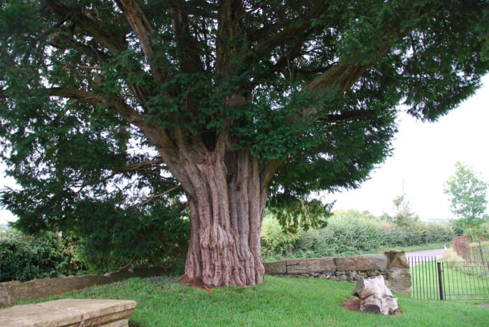Notes:The female yew grows north of the tower and nearest to the north gate. Girths recorded were 11′ 9” (358cm) at 1′ and 12′ 2” (371cm) at 3′. It has a clean fluted bole and healthy crown.