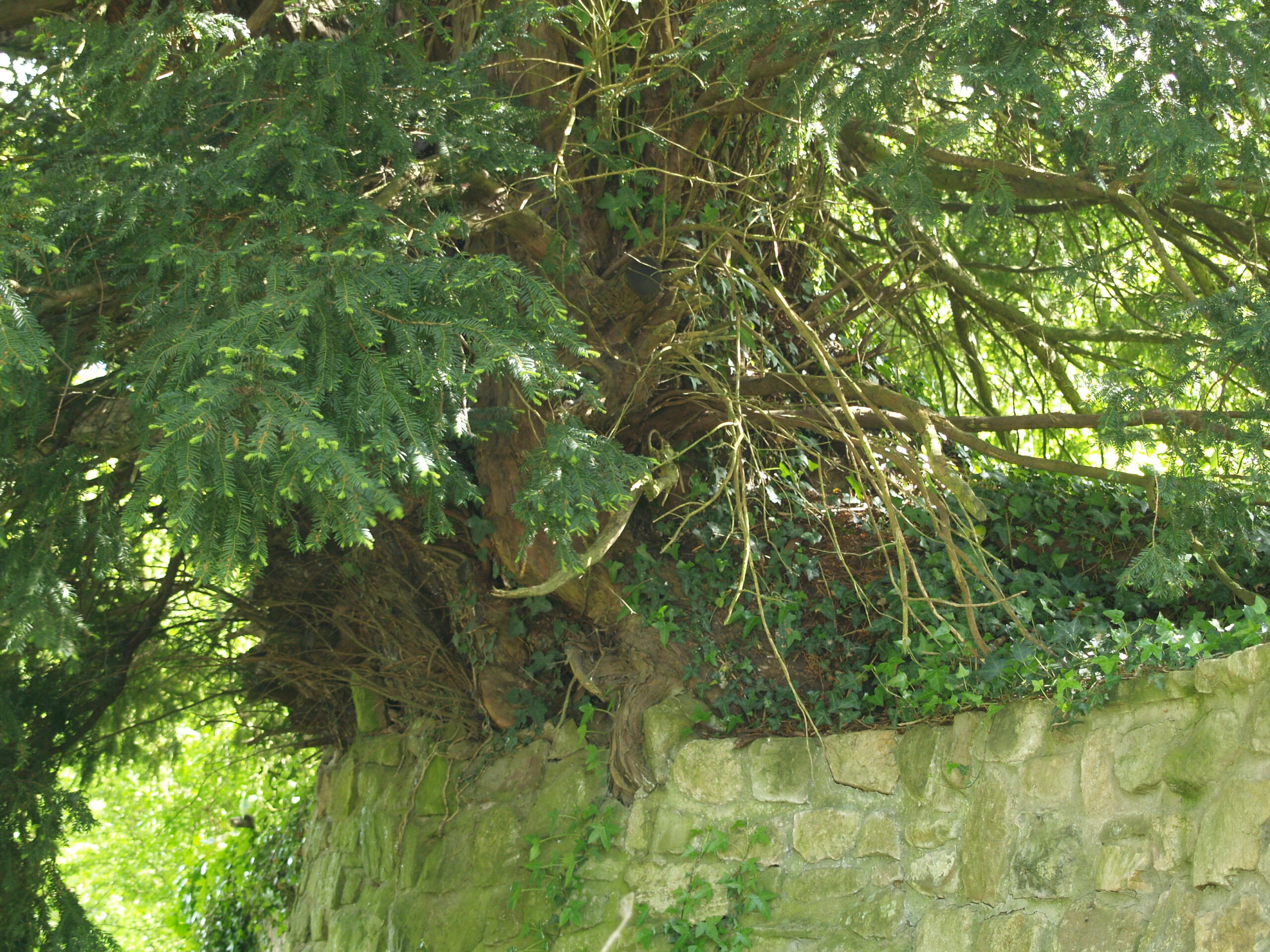 Notes:It would seem that the base of the tree was once at the bottom of the wall. Excavations at various stages of development of the nearby farmhouse have raised the ground level and gradually covered the origins of this tree. From the garden side there appears a huge solid looking trunk with branching from 5ft and the main stem developing at a height of about 10ft. Substantial new stems have developed at the edges of the tree. Foliage was a vigorous green. There were no signs of hollowing, this probably all happened below what we see now. Girth was about 24ft.