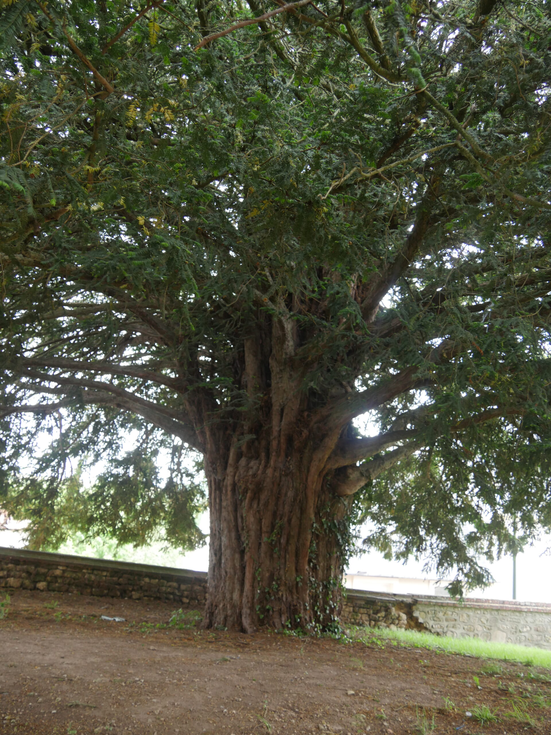 Notes:For the moment this is a solid tree of fine appearance. The 3rd photo shows where the tree will begin to hollow following the removal of a large branch on the side facing the wall. It is also possible to see where other substantial branches that would have once faced towards the church have been removed. Numerous small branches grow from a height of 6′ and upwards and in the centre is a main upright branch of great complexity. The following girths were recorded: 13′ 10” (422cm) at 1′ and 14′ 1” (429cm) at 3′.