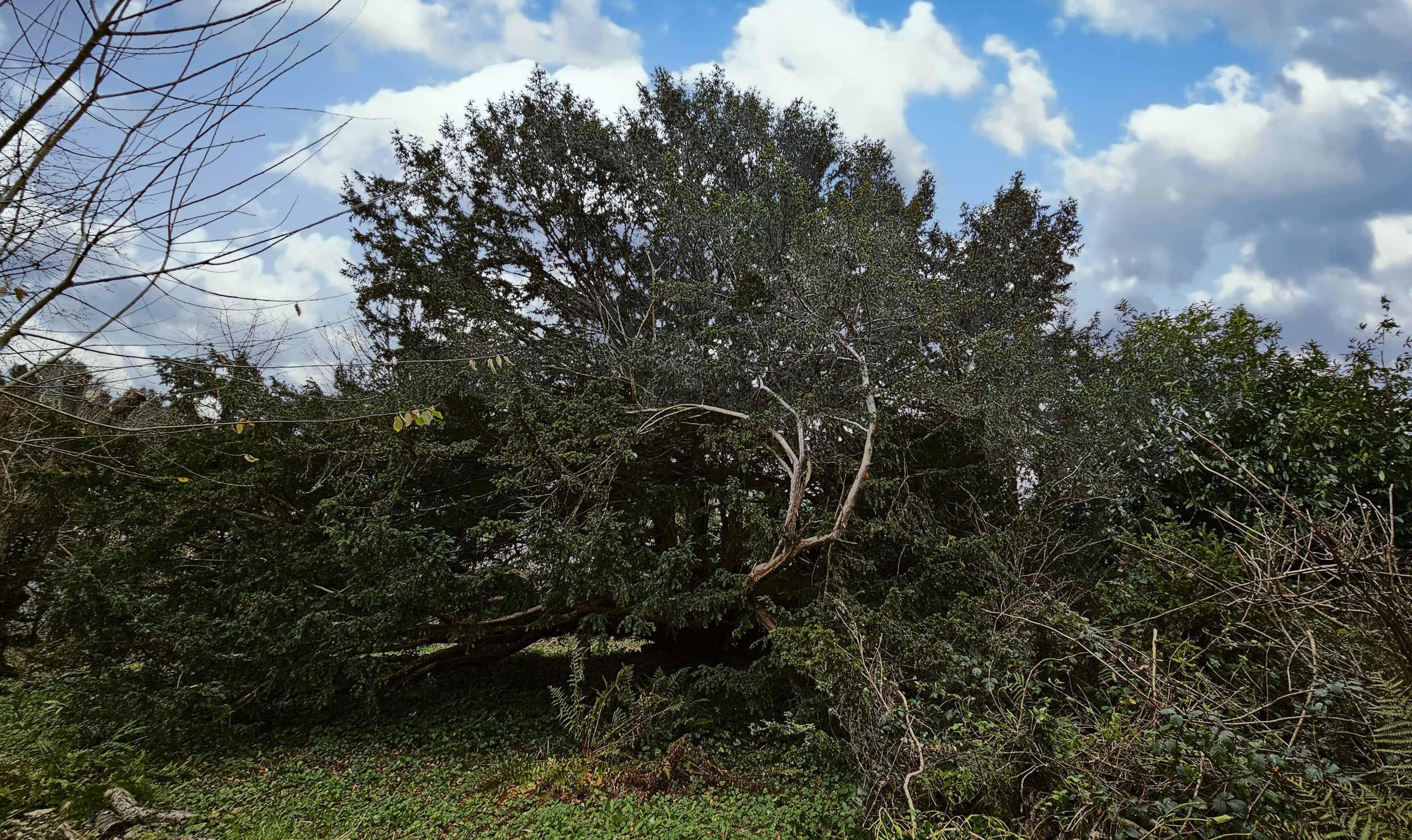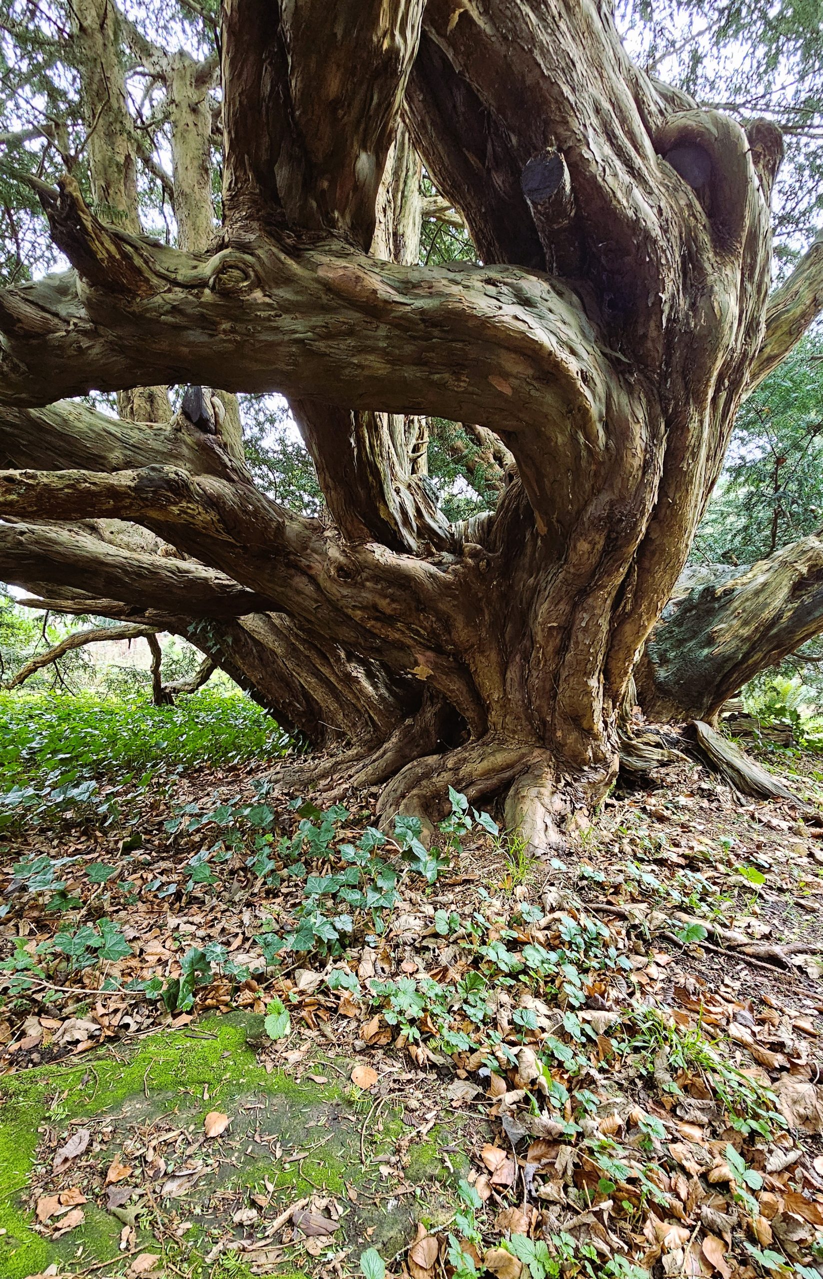 Notes:April 2006 – Tim Hills: This is undoubtedly a yew of unique appearance and worthy of attention, though the overgrown graveyard made close inspection impossible. Is it regrowth from an old stump or an old hollowing yew that collapsed? It has certainly been like this for long enough for substantial newer upright branches to grow through the tangle of very red old branches.