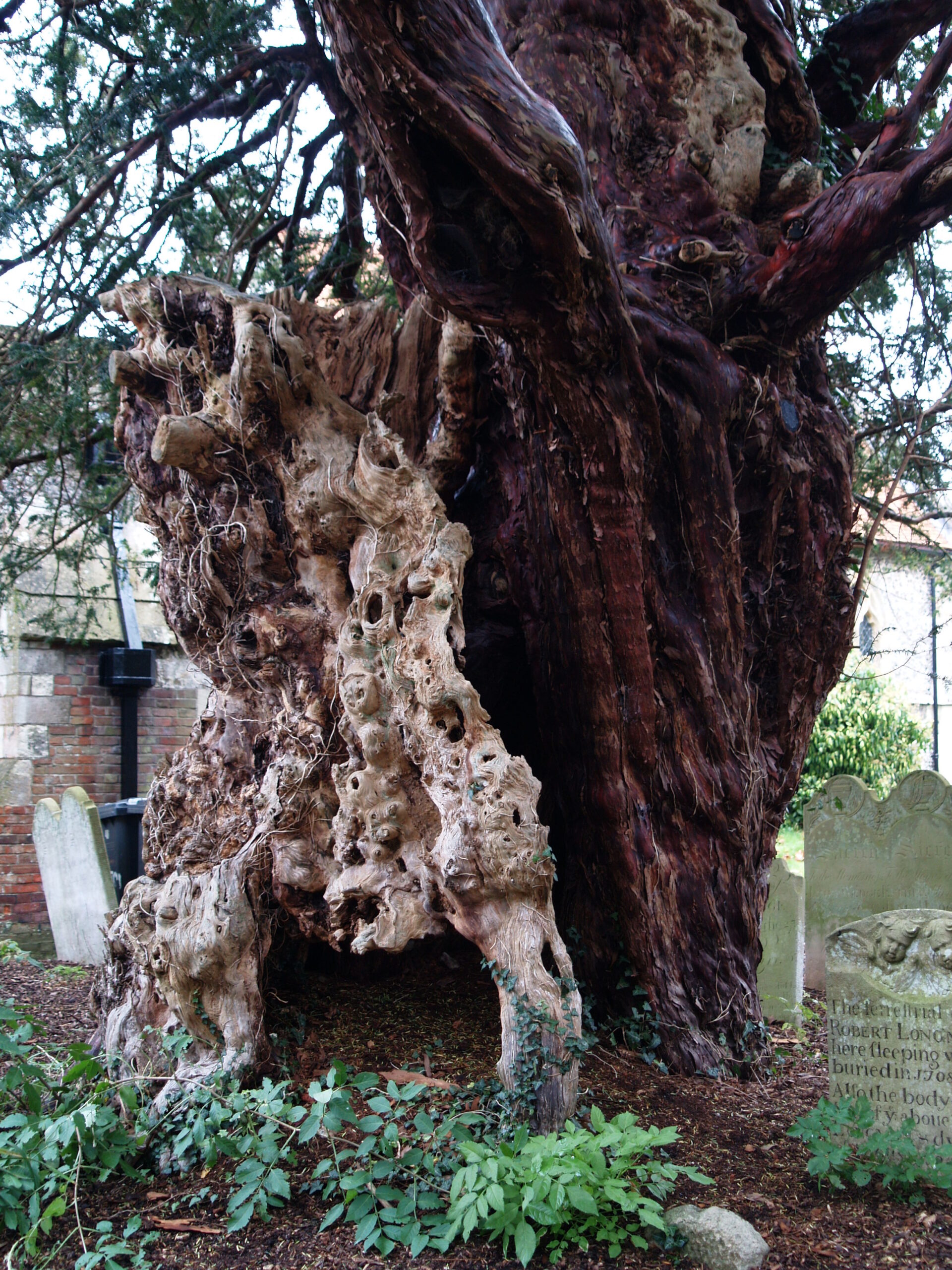 Notes:November 1998 – Tim Hills: A most unusual looking tree with an expanse of ‘sculptured’ wood. While we do not know for certain how much larger girthed it has been in the past, the yew can deservedly be placed with the most ancient of yews, those with a girth above 7m. When the large hollow section decays it will be smaller still. Inside the hollow is a fine internal stem. Girths recorded were 22′ 0” (671cm) at the ground, 20′ 10″ (635cm) at 3′ and 20′ 3″ (617cm) at 5′.