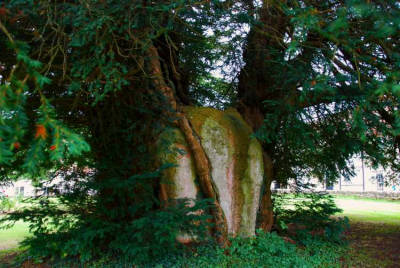 Notes:September 1998 – Tim Hills: This is a well documented yew, photographed in Victorian times with a gentleman standing inside the hollow. The photo dates from 1892 and appeared in Lowe’s The Yew Trees of Great Britain and Ireland (1897). That space was filled with concrete in the mid-1900s. Girth about 30′.
