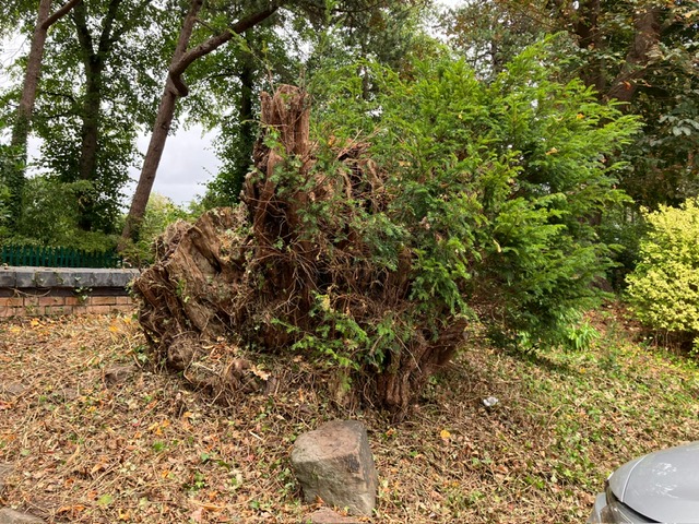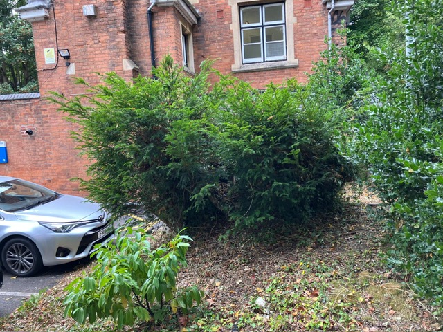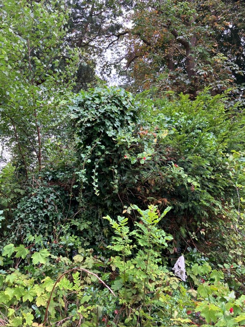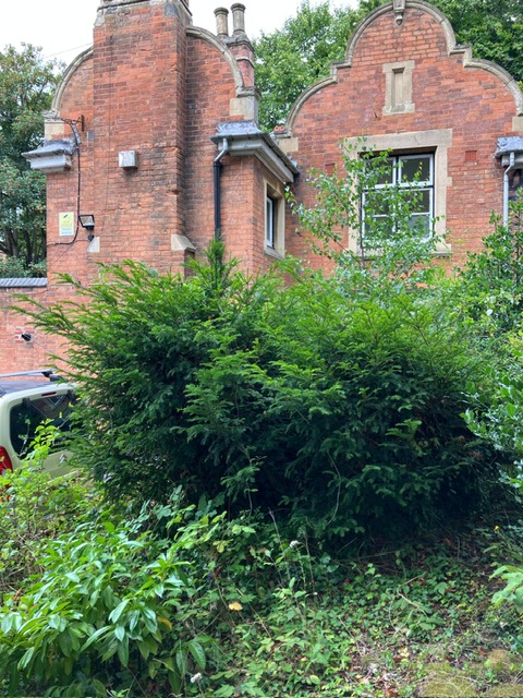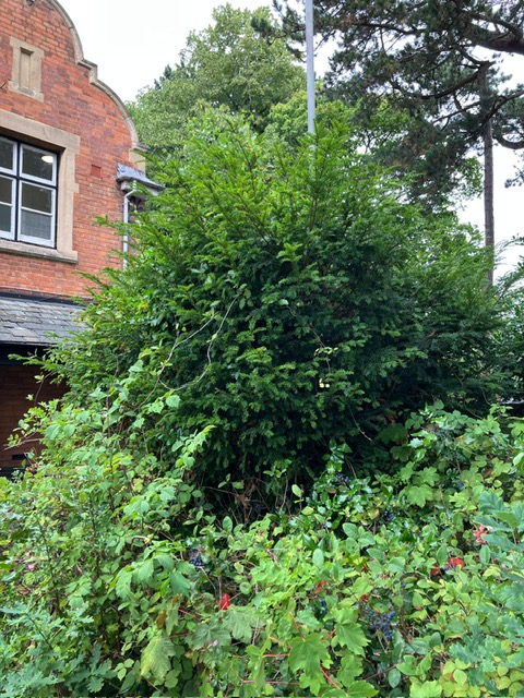 September 2025 – The yew is sprouting again and advice has been sought on how to maintain this recovery. Ellen Pisolkar’s photos show the tree before and after the clearance of ivy and other growth that was hindering the tree’s recovery.