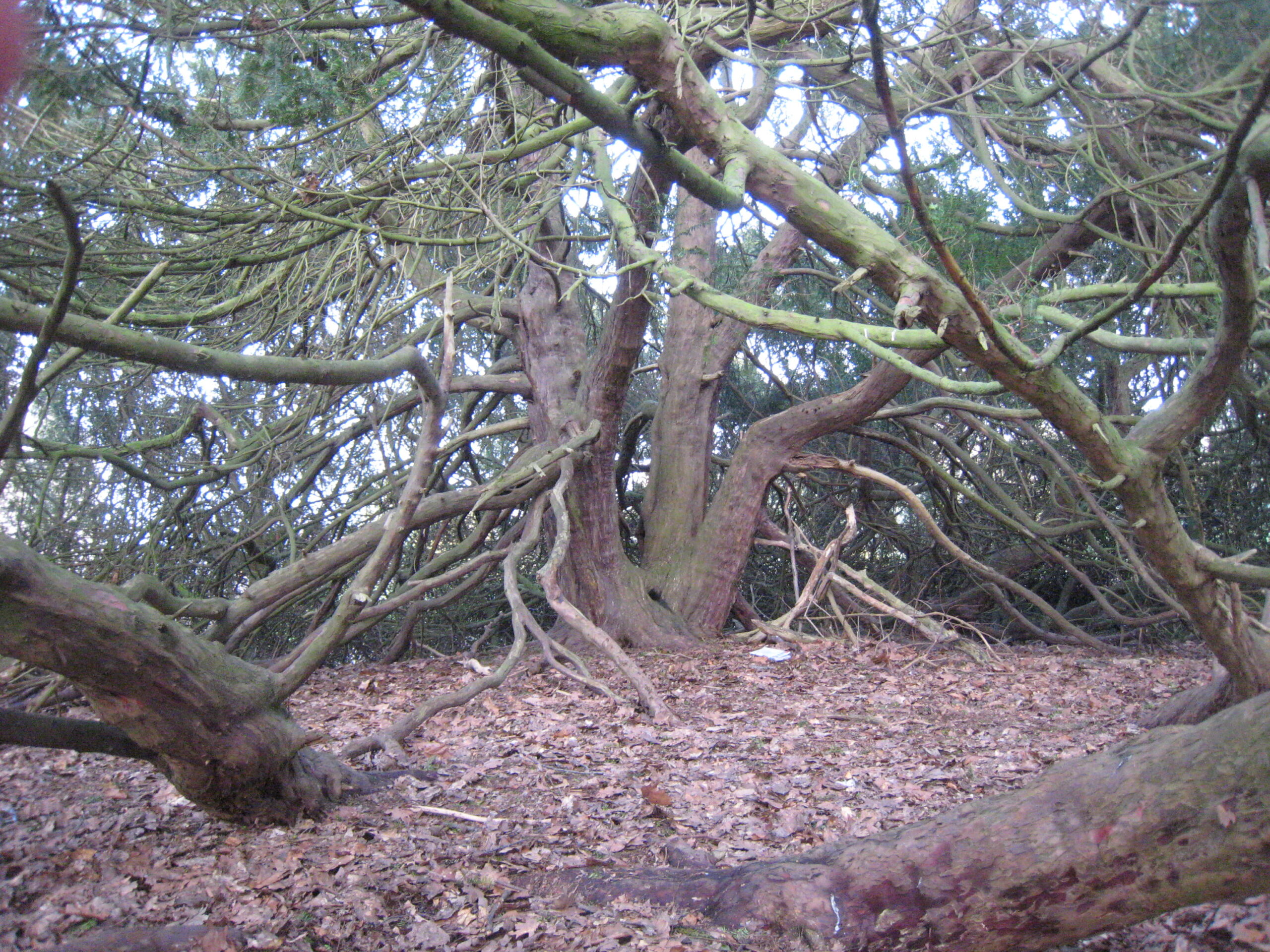 Notes:A trained yew, similar to that seen at Herefordshire-private location 2. The multi-stemmed trunk spreads in all directions from the centre and lower branches have layered. It is more than 10m from the trunk to the outer edges.