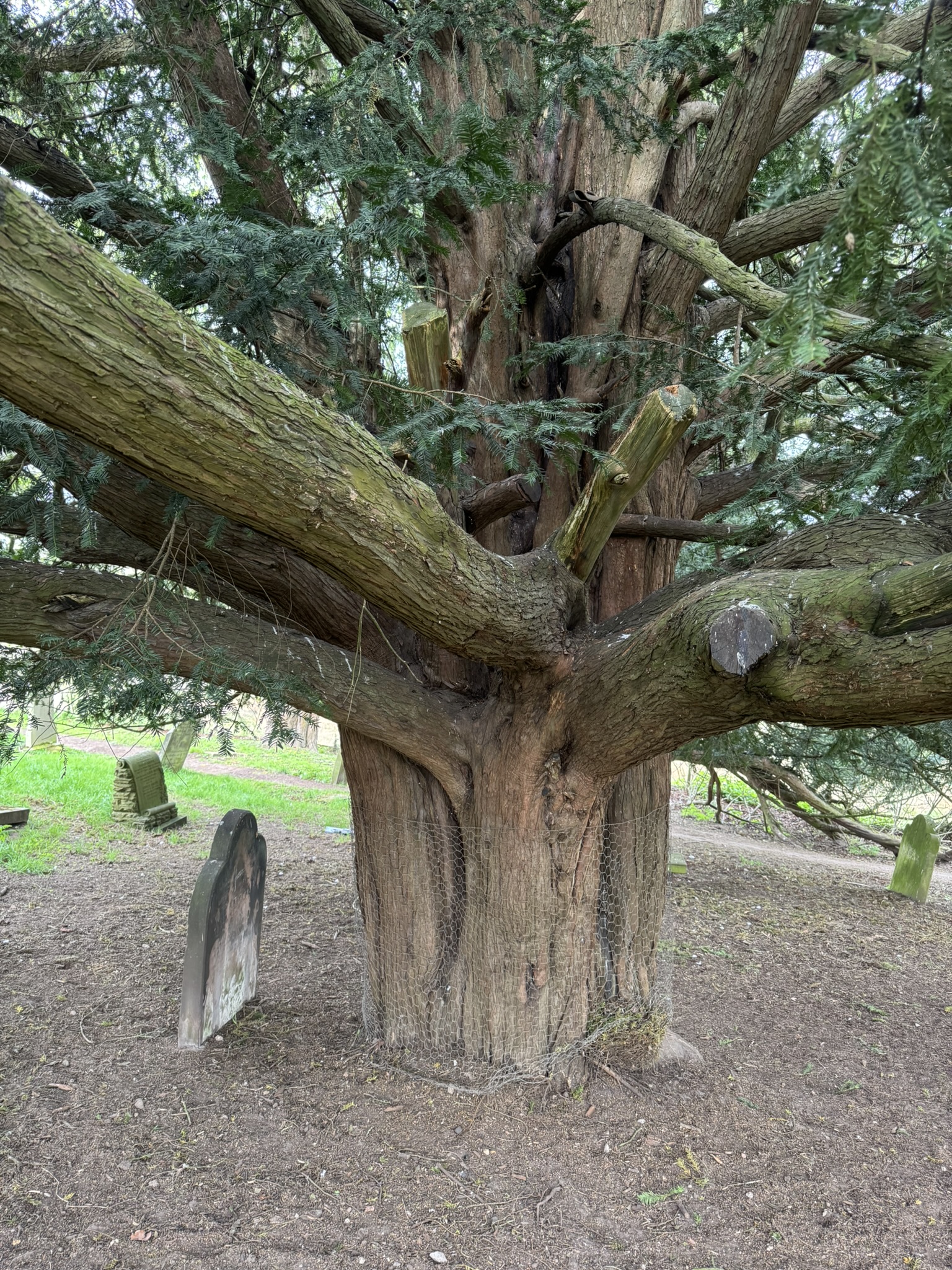 2025 – Tim Hills: The largest yew here could not be measured because of the wire around the trunk. a rough guide suggests that the tree girths about 12′.